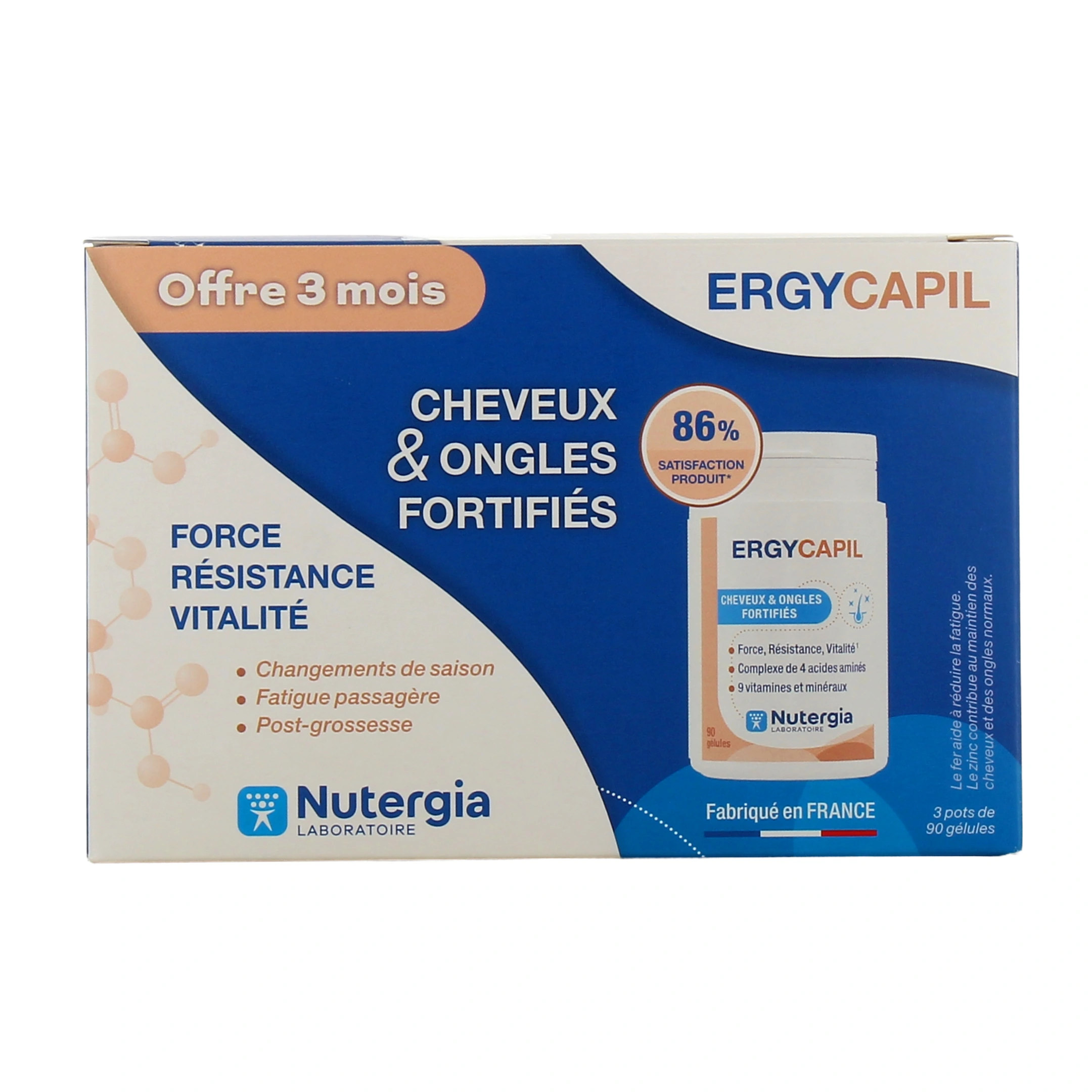 Elaboré par le laboratoire Nutergia, Ergycapil est un complément alimentaire pour des cheveux et ongles fortifiés. Grâce à un complexe de 4 acides aminés, 9 vitamines et minéraux, il soutient la force, la résistance et la vitalité des cheveux et des ongles.