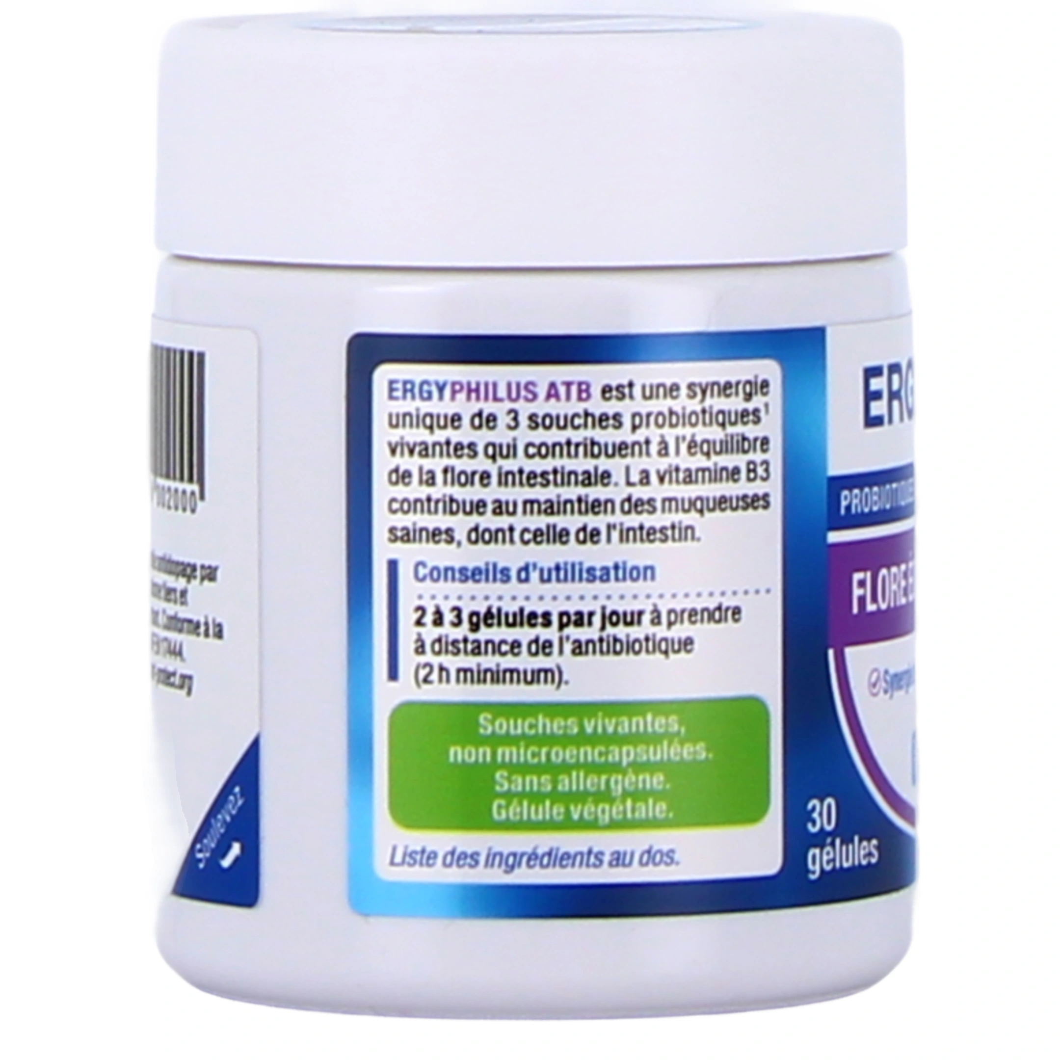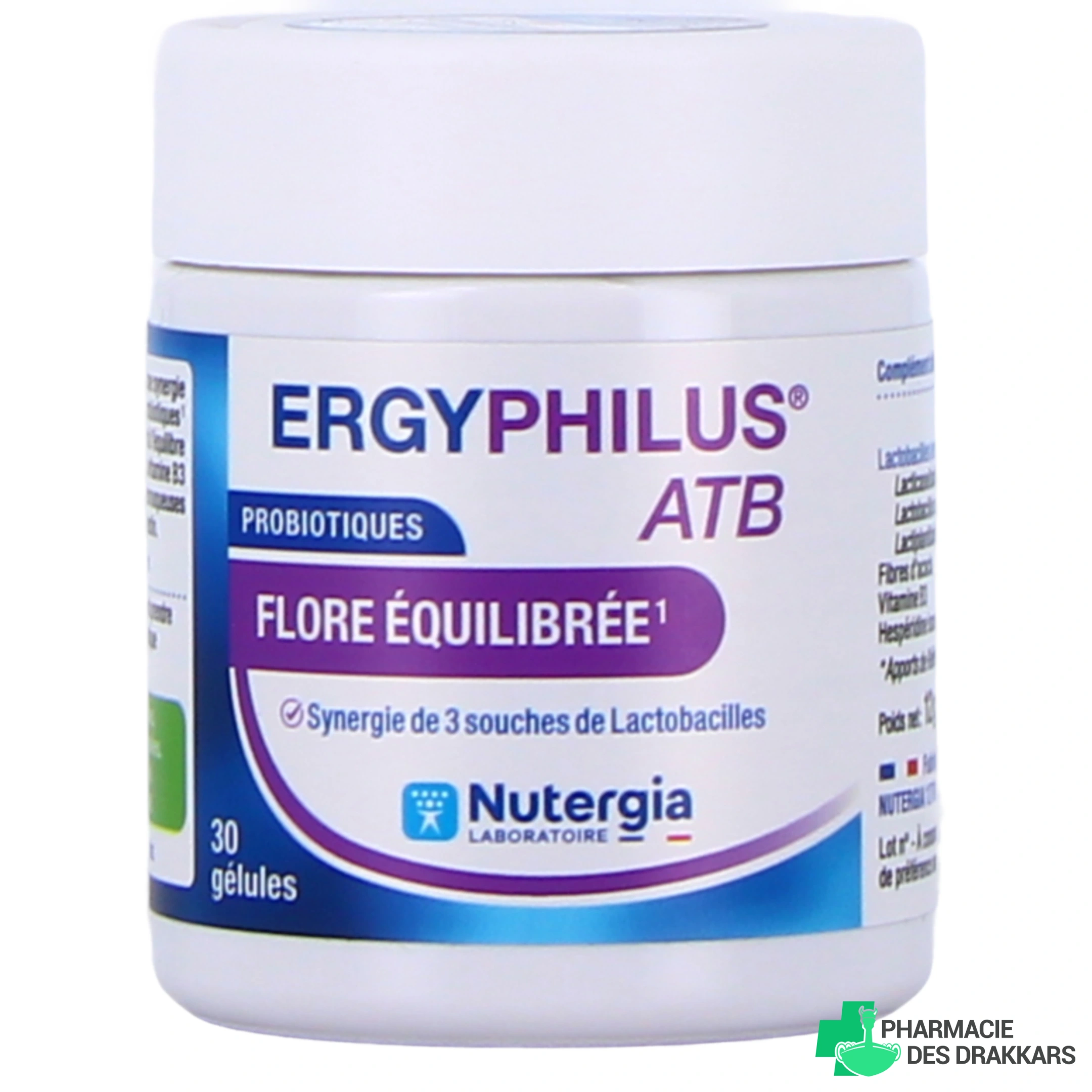 Ergyphilus ATB Nutergia repose sur la synergie unique de 3 souches de Lactobacilles revivifiables dosées à 7 milliards par gélule, et de la vitamine B3.