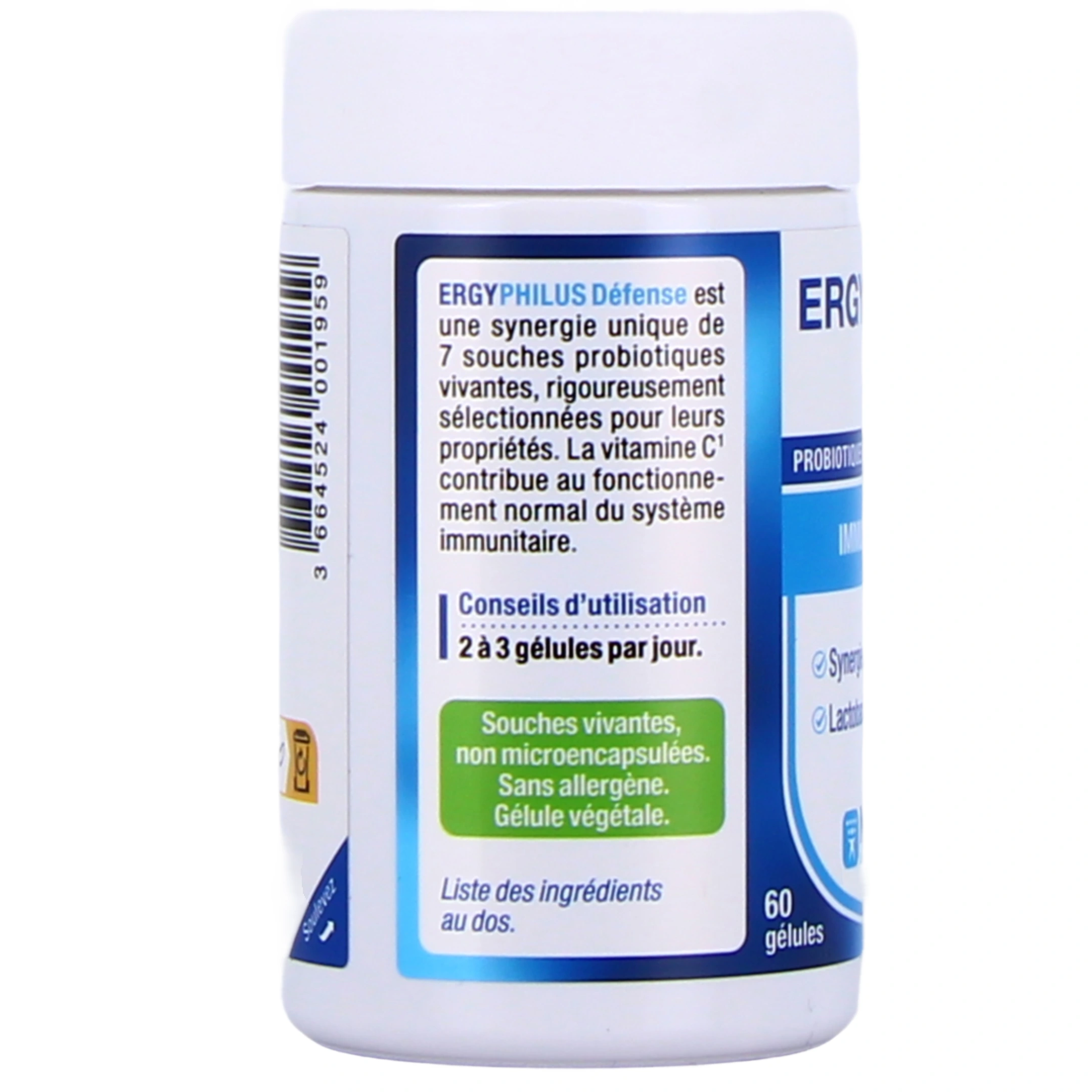 Les gélules d'Ergyphilus Défense contiennent également de la vitamine C. La vitamine C contribue au fonctionnement normal du système immunitaire. Leur formule est garantie sans gluten, sans lactose et sans soja, et contient des souches vivantes, non microencapsulées.