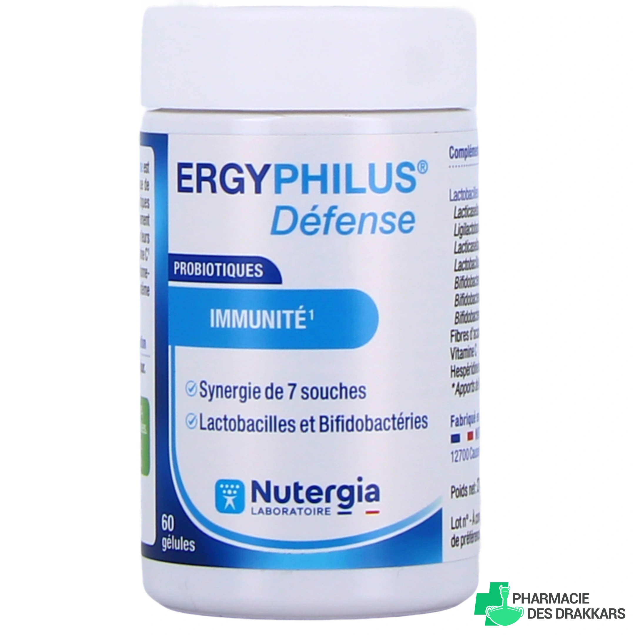 Nutergia Ergyphilus Défense est un complément alimentaire à base de 7 souches de lactobacilles et bifidobactéries dosés à 8 milliards par gélule. Il s'agit d'une synergie unique de 7 souches probiotiques vivantes (lactobacilles et bifidobactéries) rigoureusement sélectionnées pour leurs propriétés :