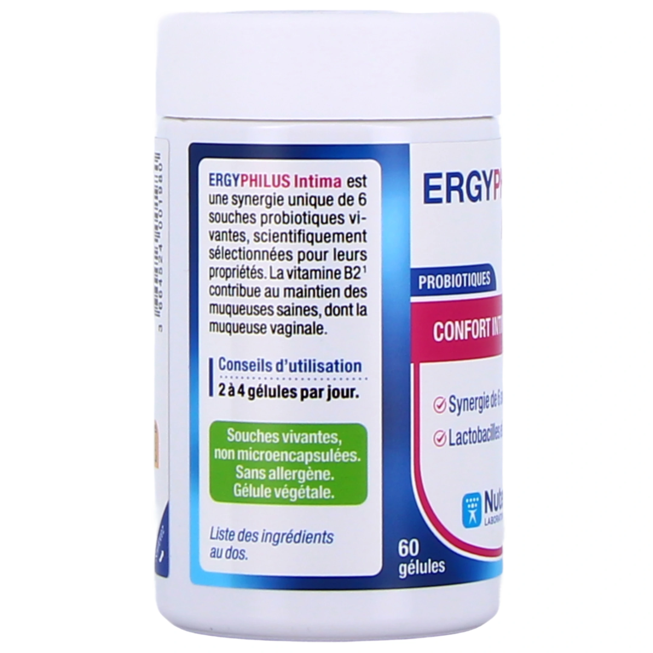 Ergyphilus Intima est un complément alimentaire du laboratoire Nutergia qui propose une synergie novatrice et unique de 6 souches vivantes sélectionnées pour leurs propriétés similaires à celles qui sont naturellement présentes dans l'organisme.