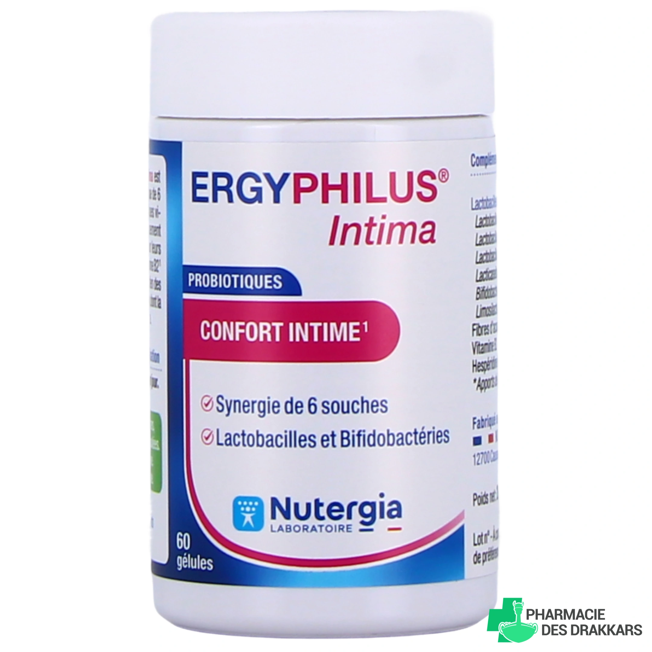 Nutergia Ergyphilus Intima offre la garantie de 8 milliards de bactéries par gélule, et la formulation est complétée par de la vitamine B2, la riboflavine, qui joue un rôle dans le maintien des muqueuses saines. Retrouvez les questions les plus couramment posées par nos patients à nos équipes au comptoir de notre Pharmacie des Drakkars :Comment utiliser Ergyphilus Intima ?