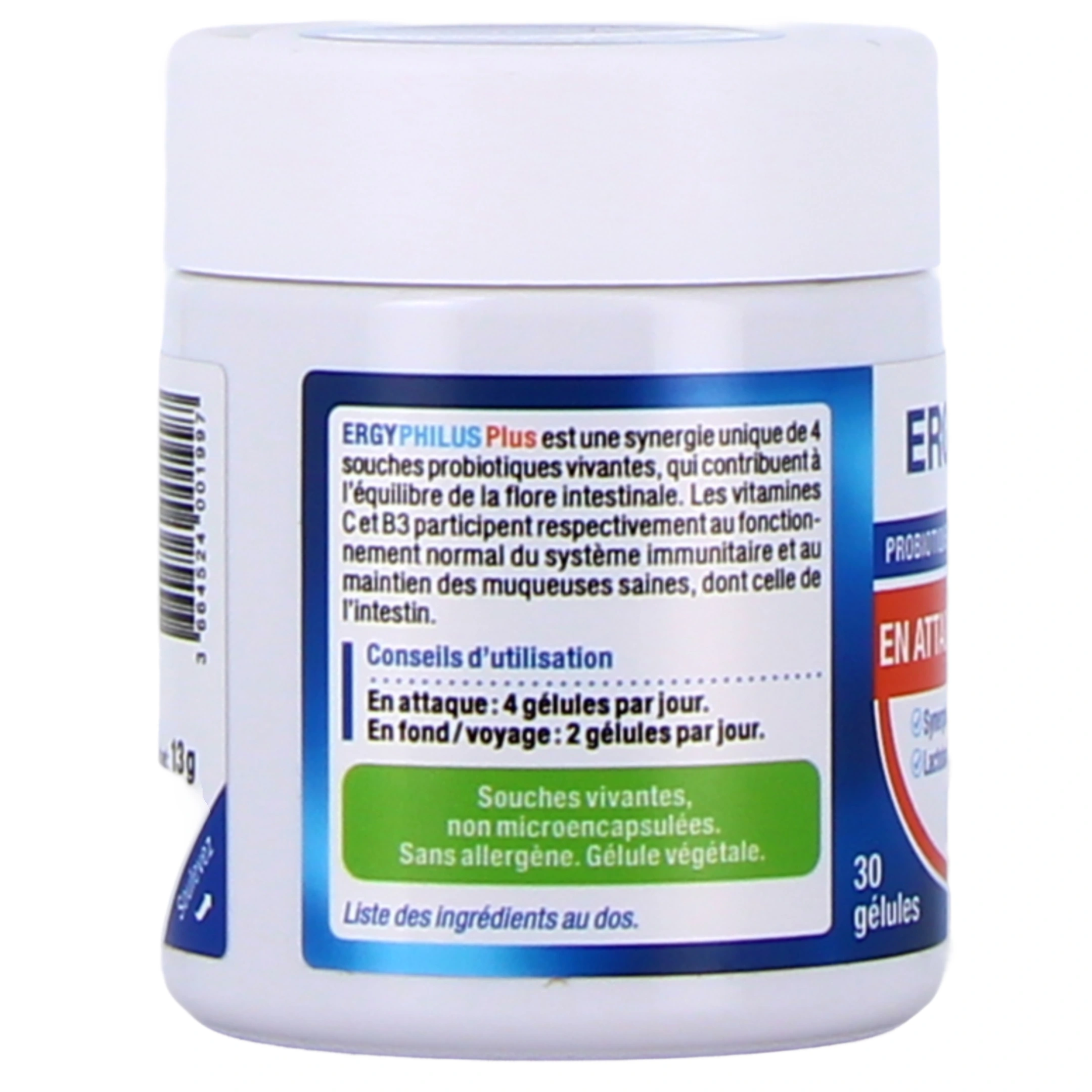 Ce complément alimentaire contient 4 souches de ferments lactiques revivifiables dosées à 32 milliards pour 4 gélules :