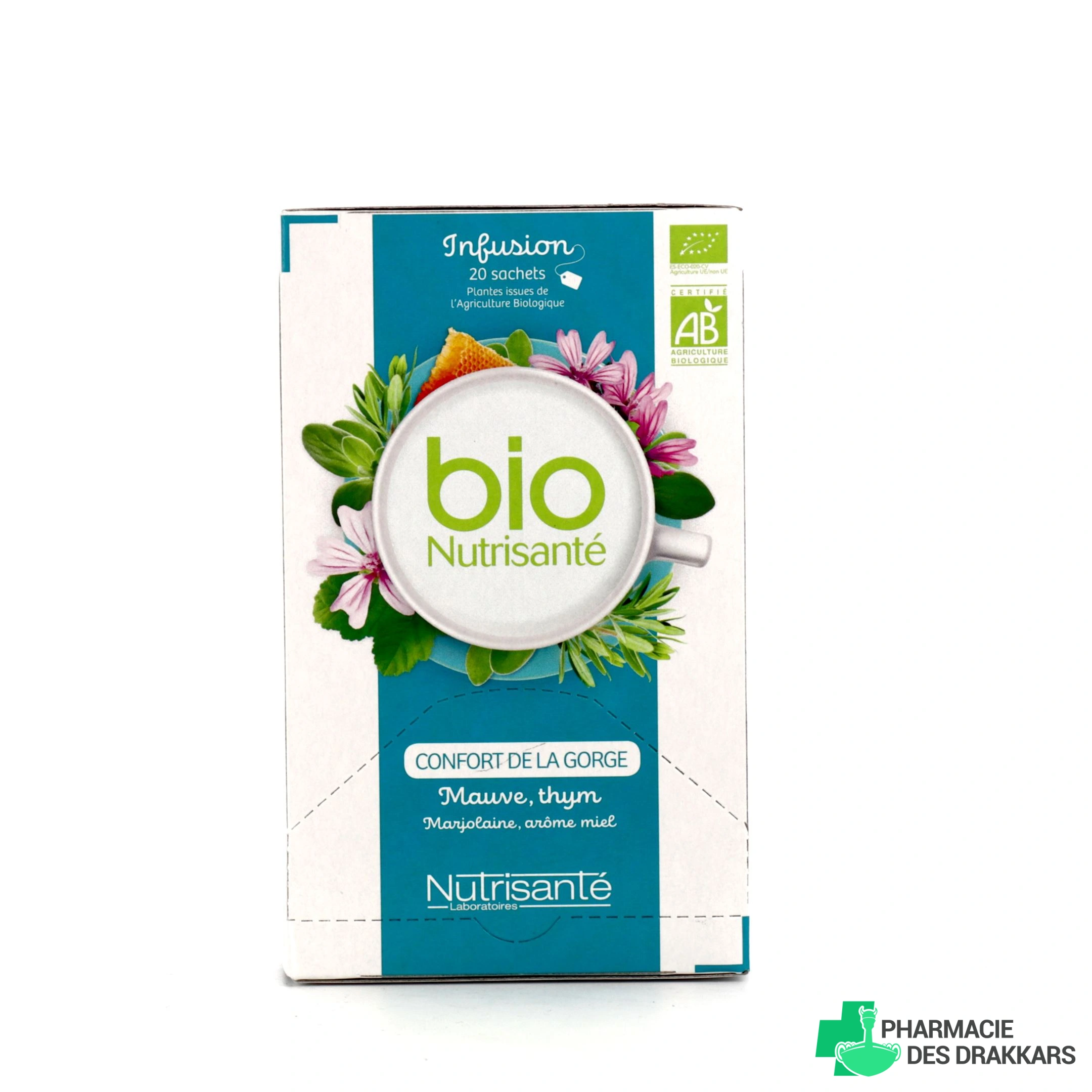 L'infusion Confort de la Gorge BIO Nutrisanté est une tisane à base de mauve et de thym qui contribuent à apaiser la gorge.