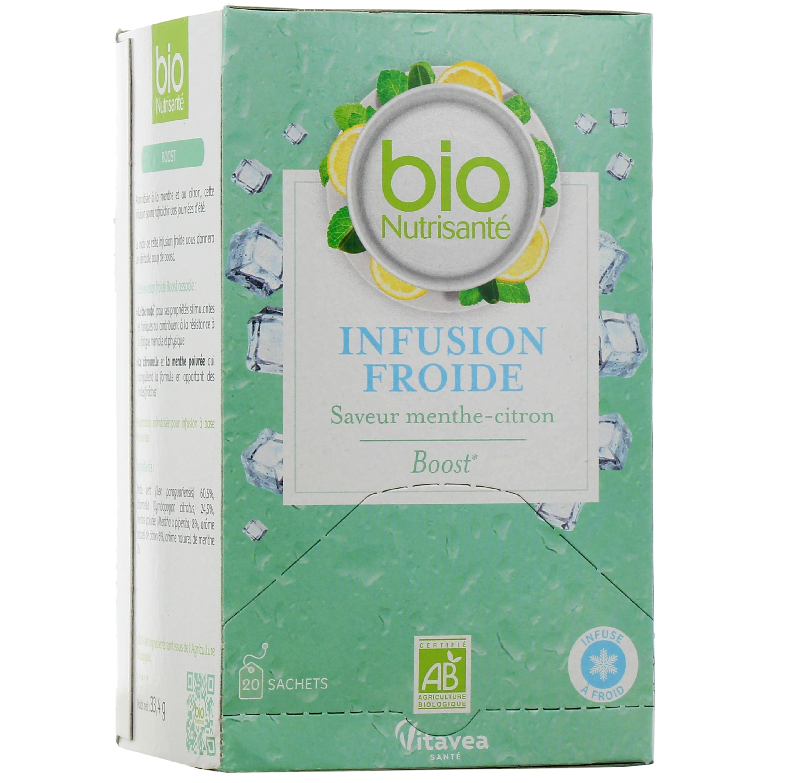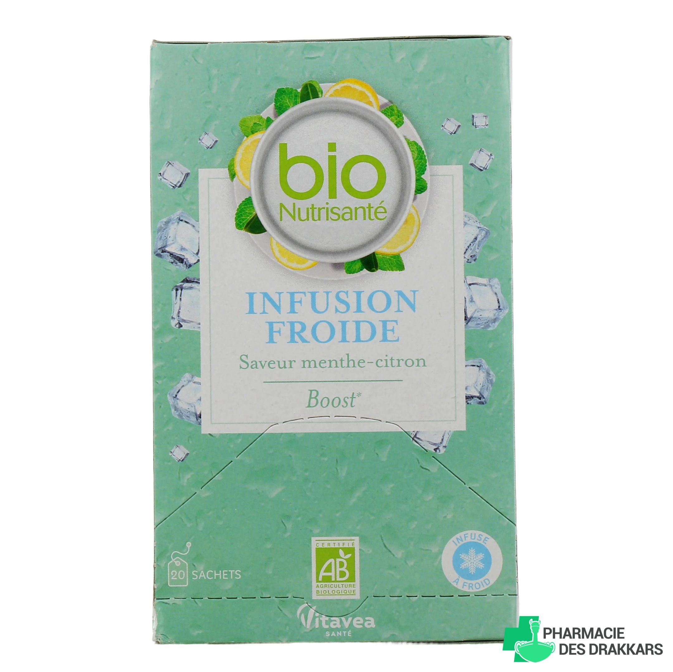 Pour profiter d'une agréable boisson rafraîchissante, notamment en été, tout en bénéficiant d'un coup de boost bienvenu, ne manquez pas l'infusion froide Boost Nutrisanté Bio Saveur Menthe Citron !