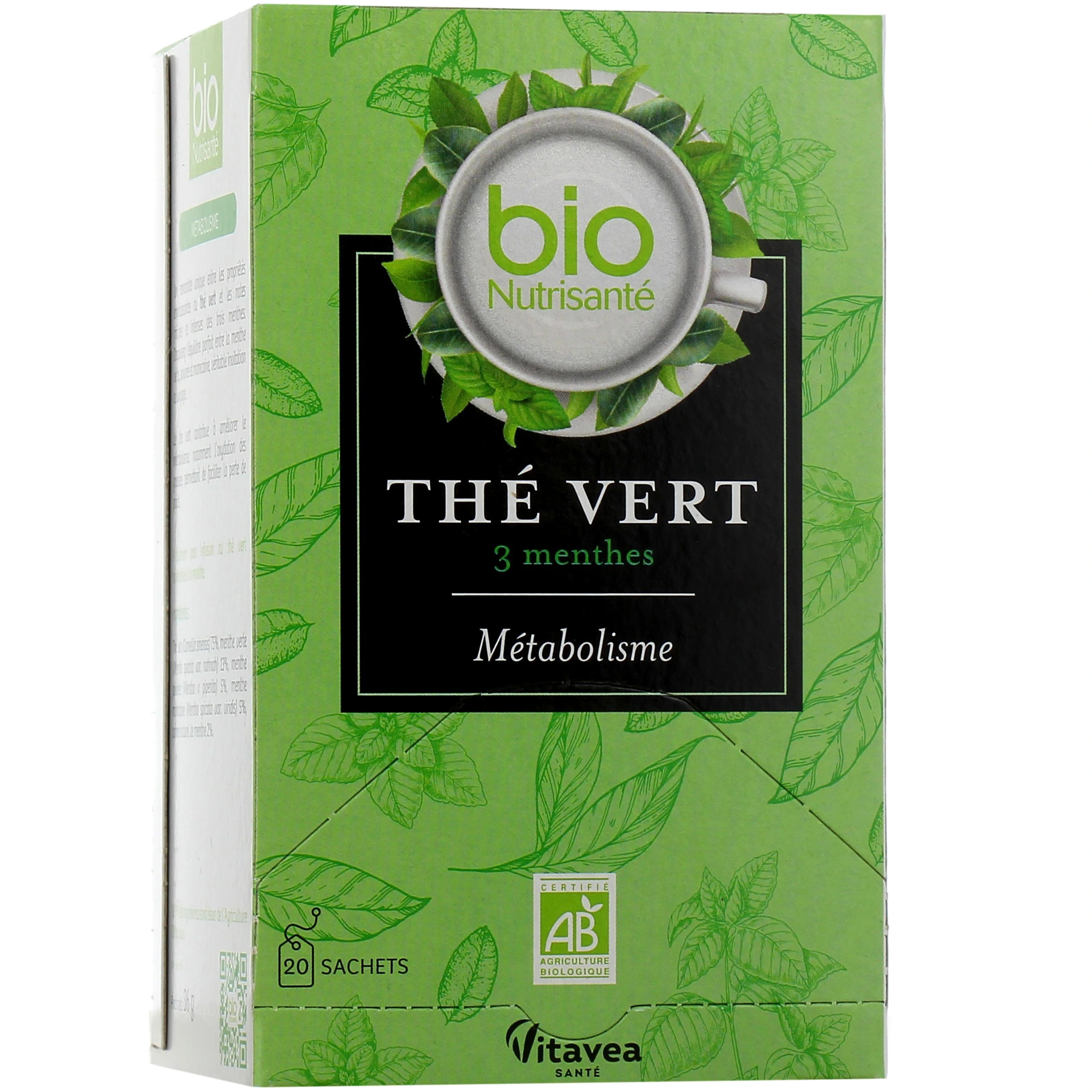 Le thé vert Métabolisme Nutrisanté est une préparation pour infusion au thé vert aromatisée à la menthe. Consommé à raison de deux tasses par jour, ce thé vert contribue à améliorer le métabolisme.