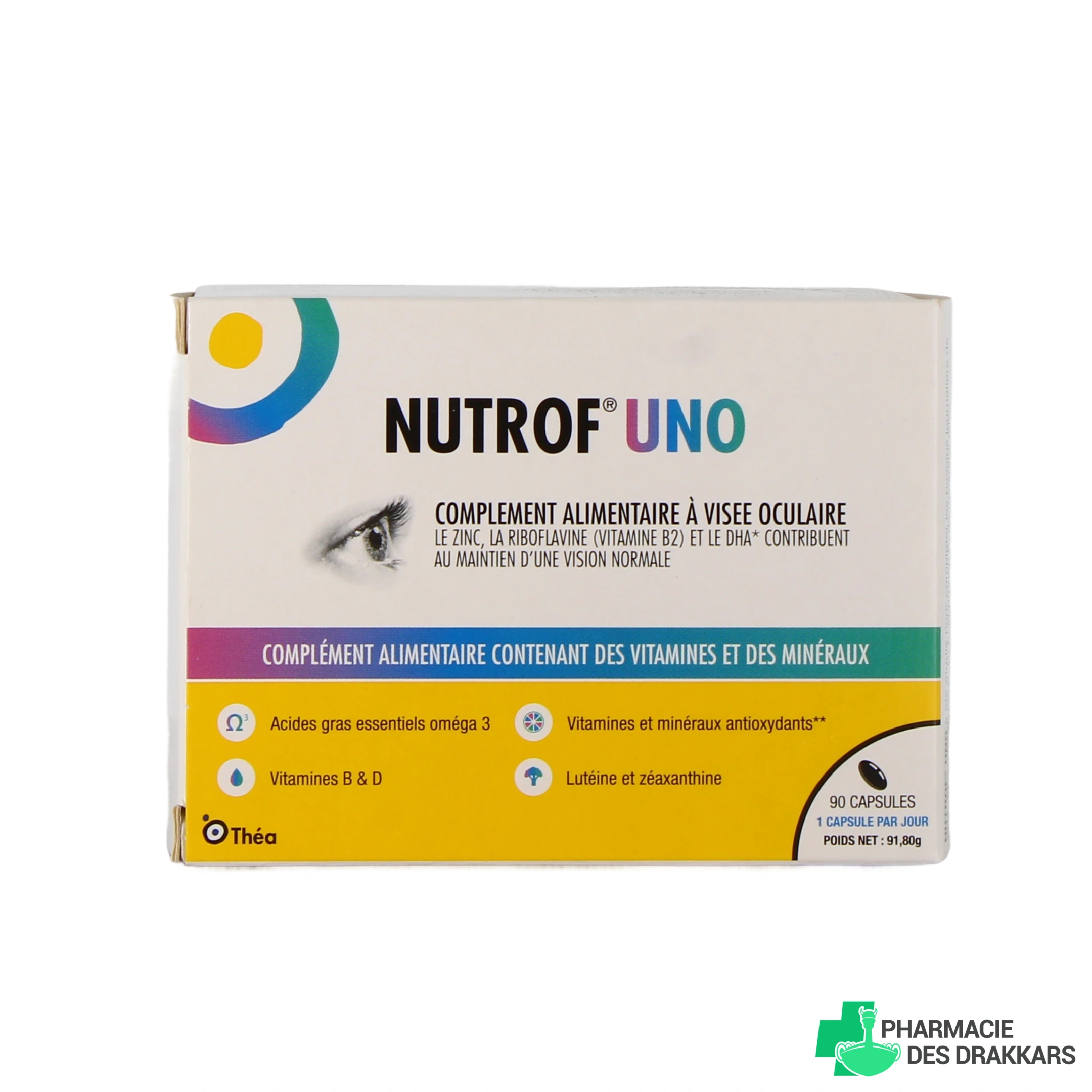 Vous pourrez sélectionner le complément alimentaire à visée oculaire Nutrof Uno de Théa parmi les conditionnements suivants chez Pharmacie des Drakkars : boîte de 90 capsules.