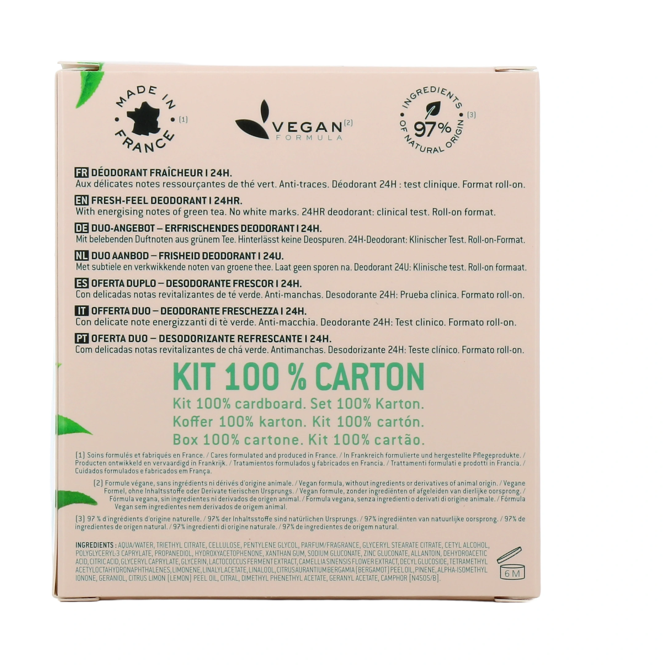 La formule de ce déodorant Nuxe intègre 97 % d'ingrédients d'origine naturelle. On retrouve notamment 3 actifs qui s'adaptent aux besoins de la peau pour prévenir les odeurs de transpiration. L'extrait de feuilles de thé vert, tout d'abord, apporte ses propriétés antioxydantes et détoxifiantes, ainsi que son pouvoir antibactérien. La glycérine, humectante, contribue à maintenir l'hydratation et renforcer le film hydrolipidique. Enfin, le probiotique Lactococcus lactis vient renforcer le microbiote cutané au niveau des aisselles, limitant les irritations et le développement des mauvaises odeurs.