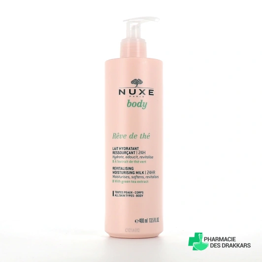 Composé de 98% d'ingrédients qui sont garantis d'origine naturelle, le Lait hydratant ressourçant Rêve de thé est source d'une douceur irrésistible et addictive grâce à sa texture aussi fraîche que fondante pénètre rapidement la peau, et permet en conséquence de pouvoir s'habiller tout de suite après avoir appliqué ce soin. Ce soin cosmétique Nuxe délivre également un délicat parfum qui met les sens en éveil, et leur apporte un surplus de vitalité qui saura bousculer les routines du quotidien.