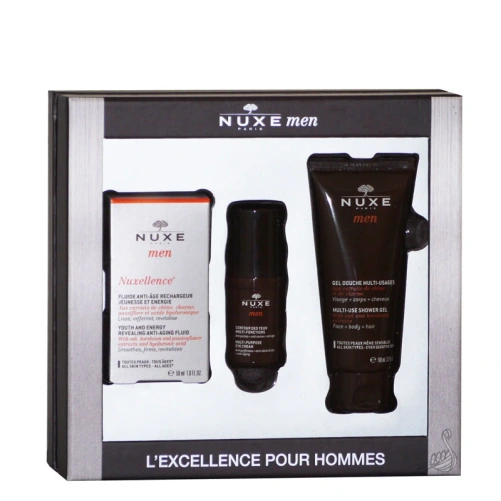 Le coffret Premium NUXE est un coffret destiné aux hommes qui aiment prendre soin d'eux. Ce coffret "l'excellence pour hommes" associe Nuxellencele Fluide Anti-Âge Rechargeur Jeunesse et Énergie, le contour des yeux multi-fonctions et le gel douche multi-usages.