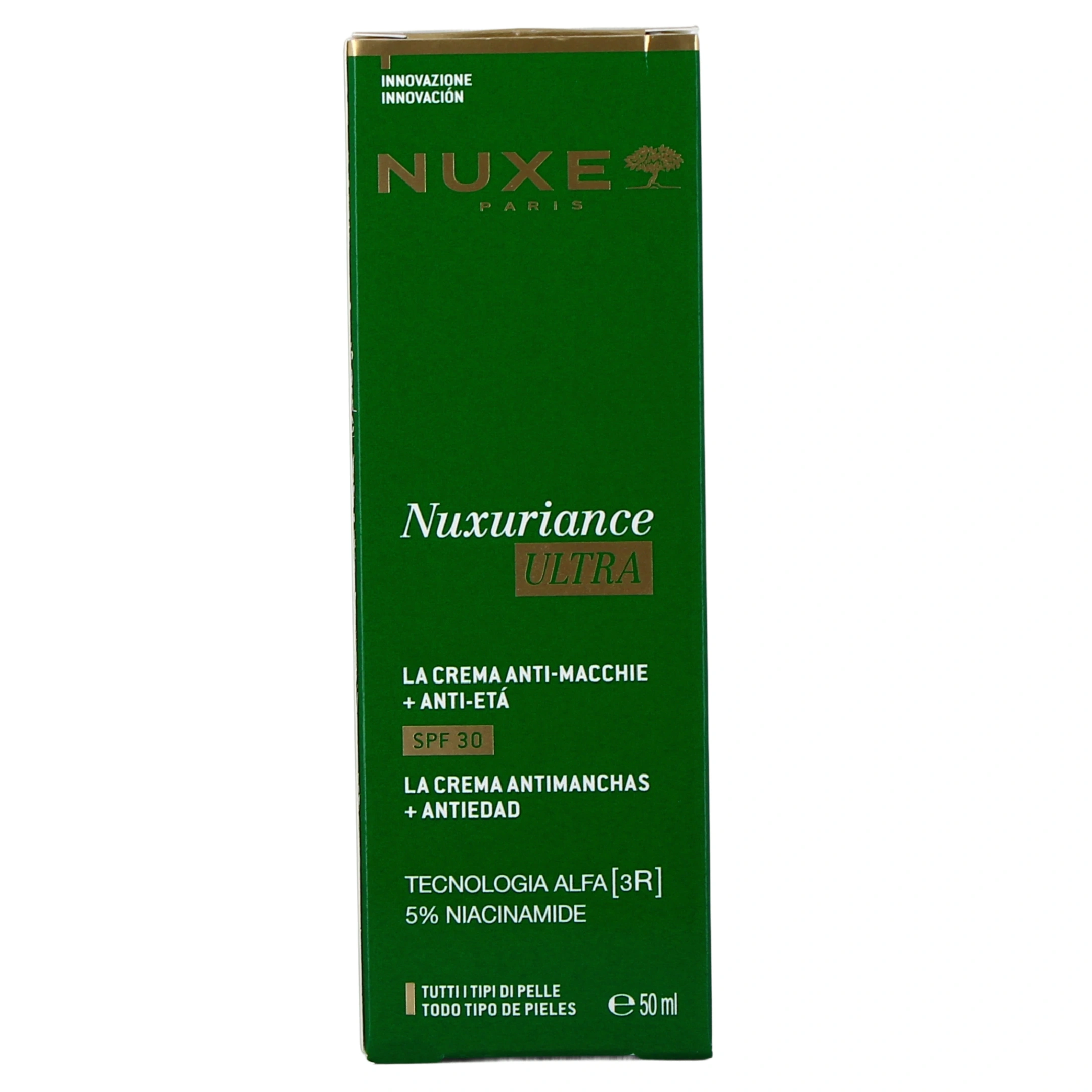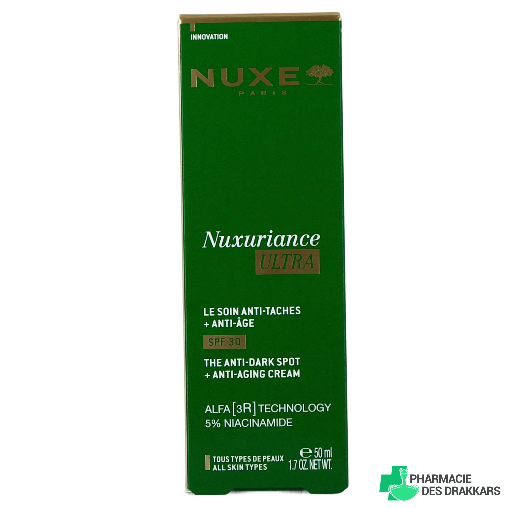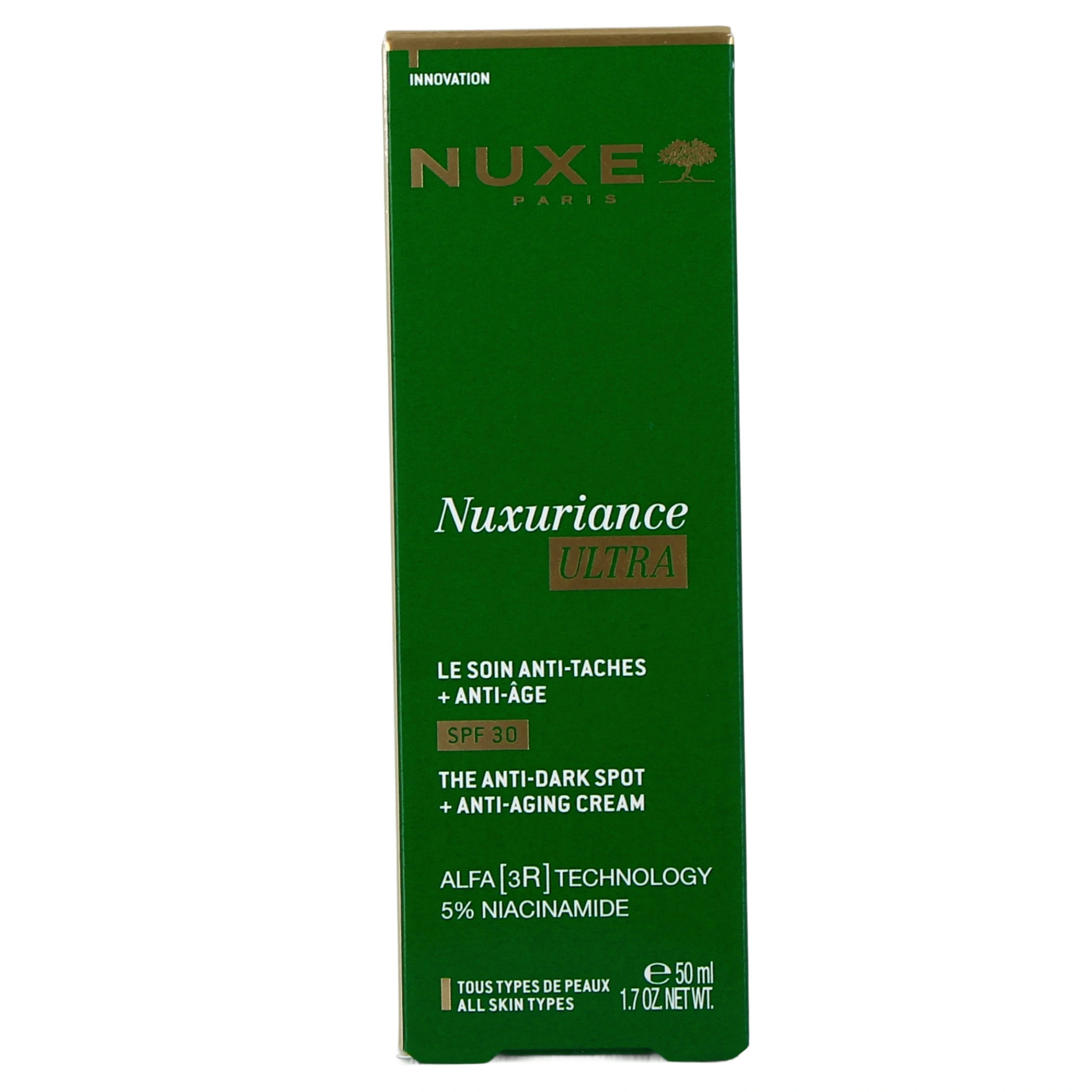 Le soin anti-taches + anti-âge SPF 30 de la gamme Nuxuriance Ultra Nuxe est un soin quotidien complet qui unifie, illumine et tonifie la peau tout en la protégeant du photo-vieillissement. Grâce à sa technologie exclusive Alfa [3R], plus efficace que le rétinol, il agit simultanément sur les taches pigmentaires et les principaux signes de l'âge. Jour après jour, le teint est plus lumineux, la peau est plus ferme et visiblement plus uniforme.