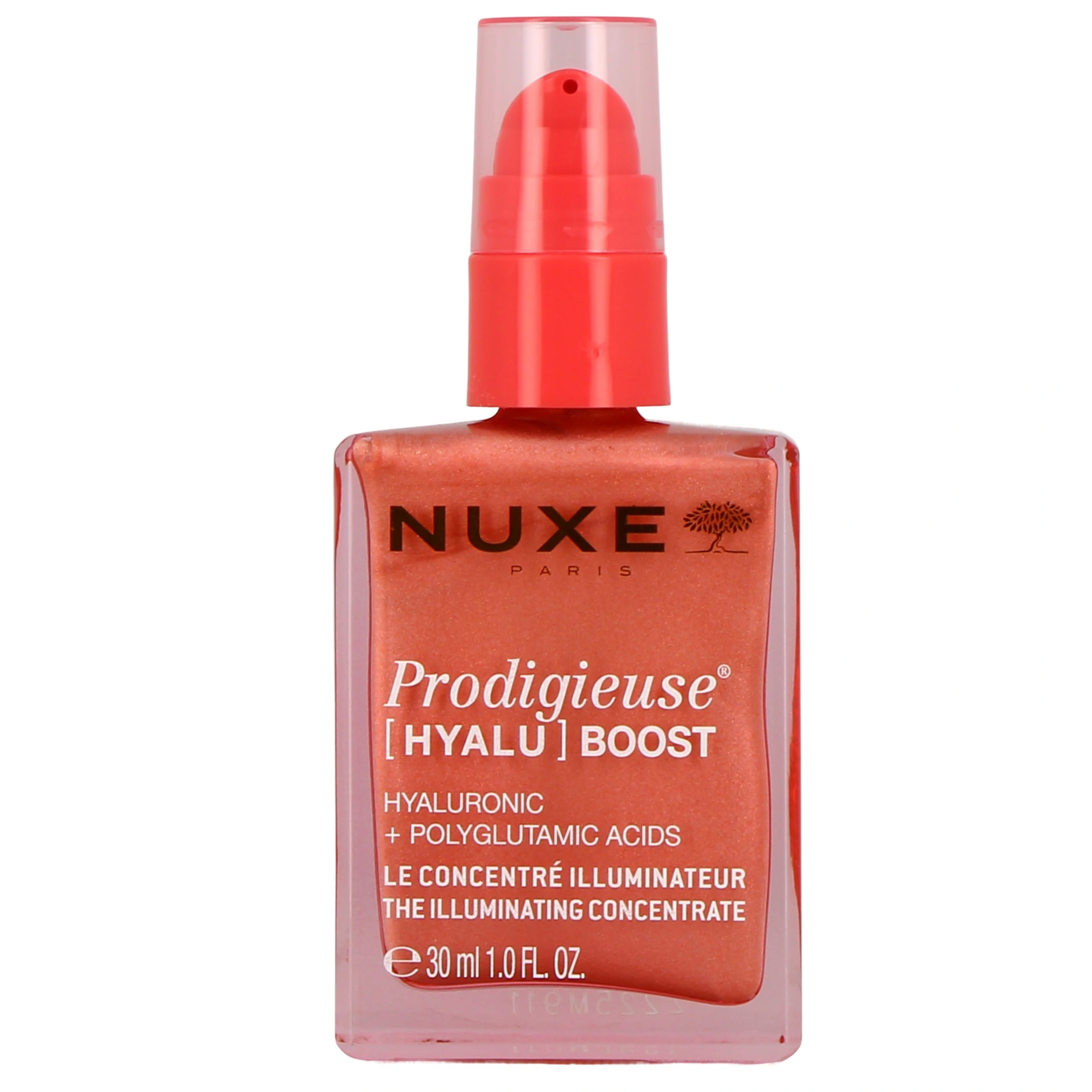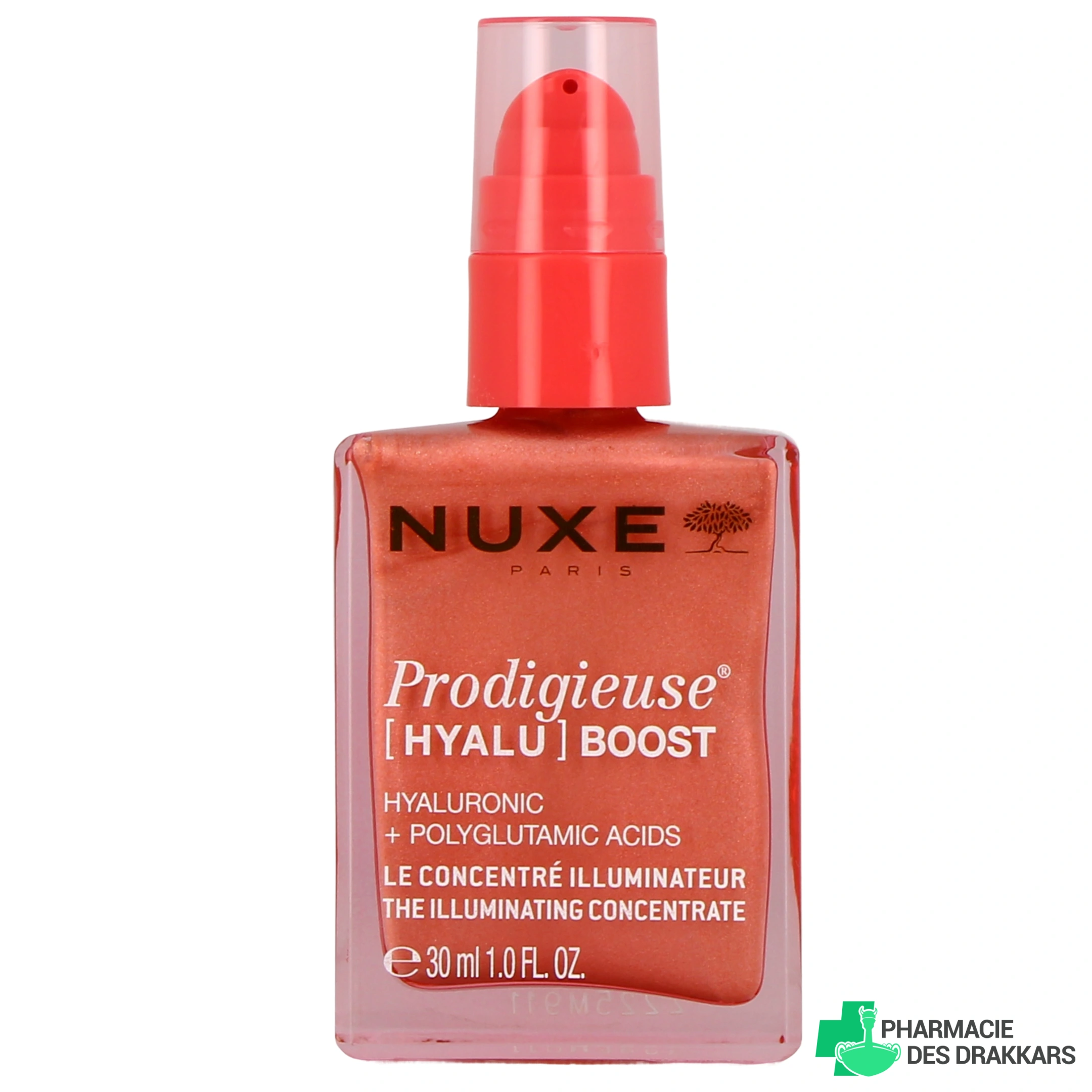 Présentation disponible sur notre pharmacie en ligne pour le concentré illuminateur Nuxe Prodigieuse Hyalu Boost : flacon-pompe de 30 ml.