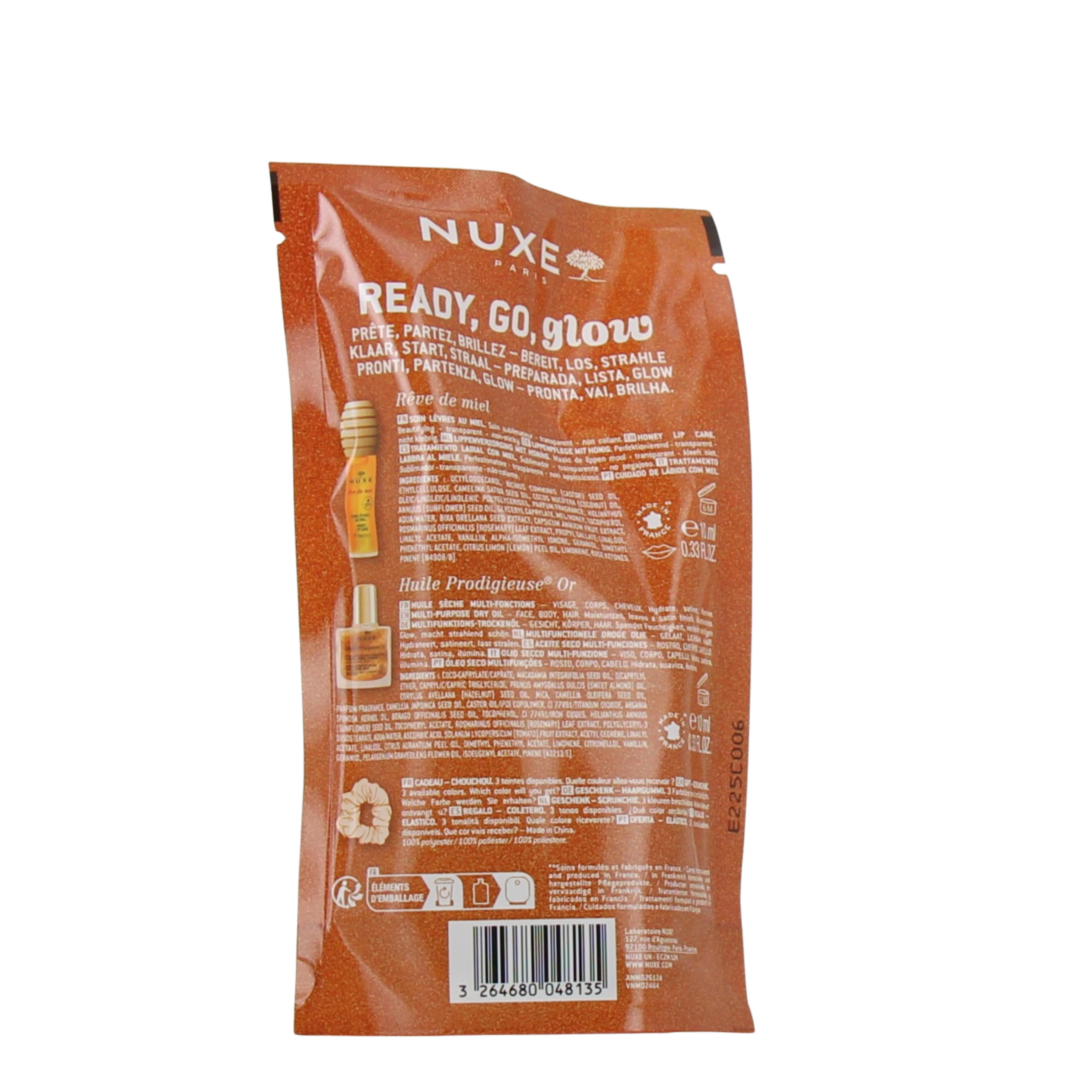 - Sachet or contenant une huile sèche multi-fonctions Prodigieuse Or 10 ml + un soin lèvres au miel Rêve de miel + un chouchou offert ;