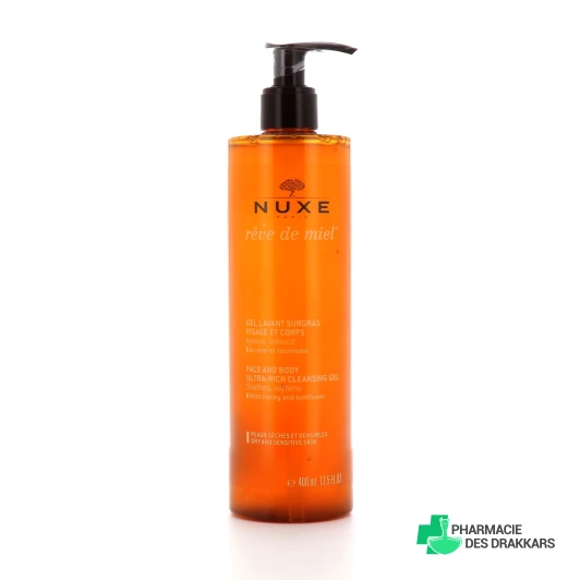 Fabriqué en France sans savon, le gel lavant surgras Rêve de miel de Nuxe dégage de délicieux effluves miellés enveloppants, pour détendre aussi bien votre peau que votre esprit. C'est un gel douche onctueux destiné au soin quotidien des peaux sèches, tout en respectant leur sensibilité grâce au miel et au tournesol. Bénéficiez d'une vraie sensation cocooning sous la douche ou dans votre bain !