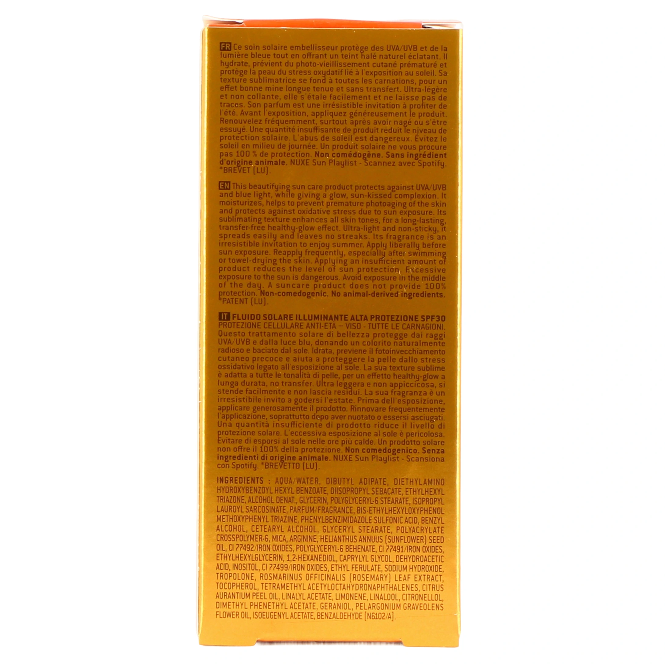 Le fluide solaire bonne mine SPF30 de Nuxe Sun protège la peau tout en sublimant le teint d'un hâle naturel et lumineux. Grâce à sa haute protection solaire et à ses pigments d'origine naturelle, ce soin Nuxe Sun unifie le teint, rend la peau hydratée et visiblement embellie. Sa texture légère et son fini non gras offrent un confort optimal au quotidien.