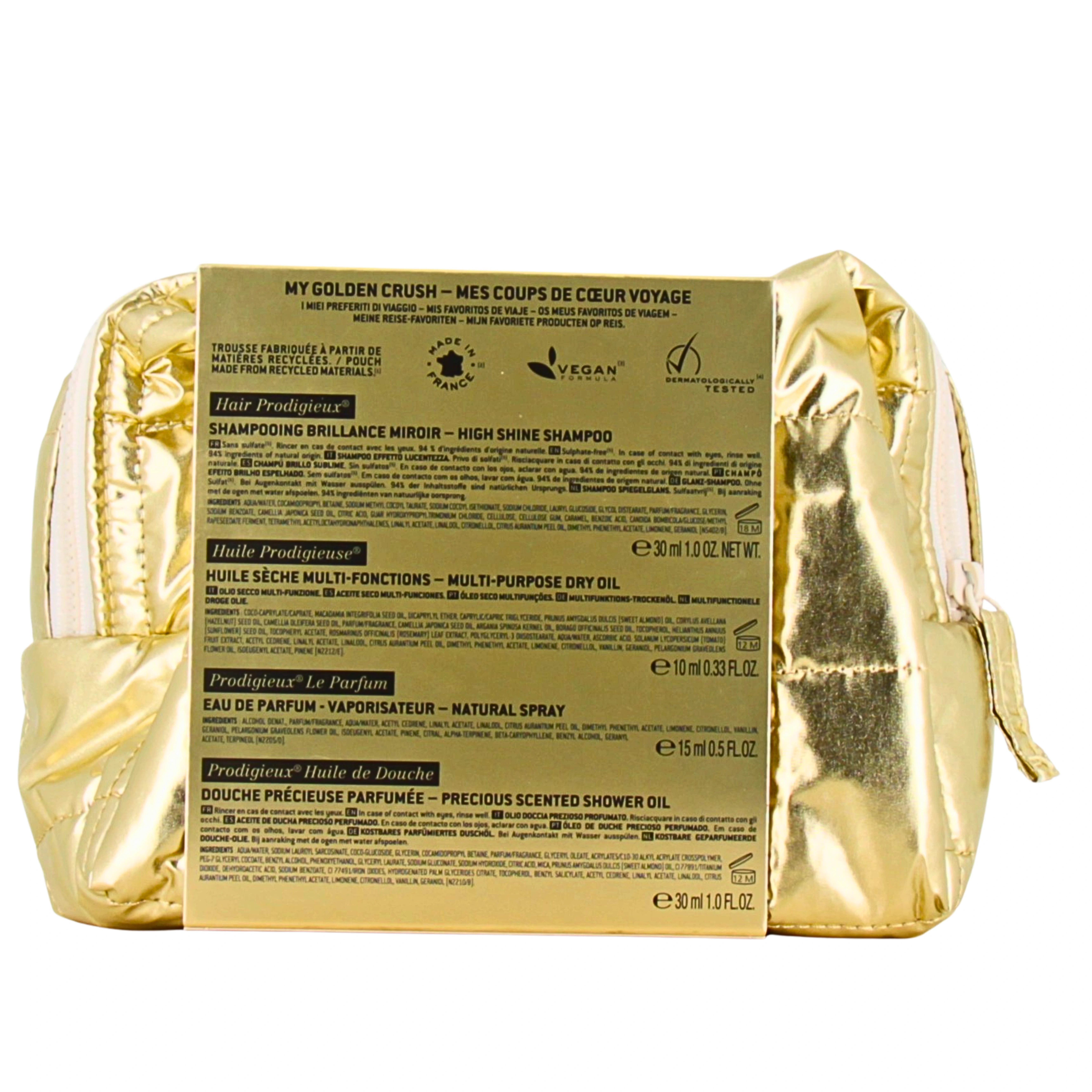 A l'intérieur de la trousse My Golden Crush, Nuxe a réuni ses incontournables dans des formats pratiques à emmener partout. Chacun de ces produits a été pensé pour offrir une expérience sensorielle unique, alliant efficacité et plaisir d'utilisation. Du soin capillaire au parfum culte en passant par l'huile multi-fonctions, la sélection de cette trousse Nuxe permet de profiter et de tester le meilleur de la gamme Nuxe Prodigieux.