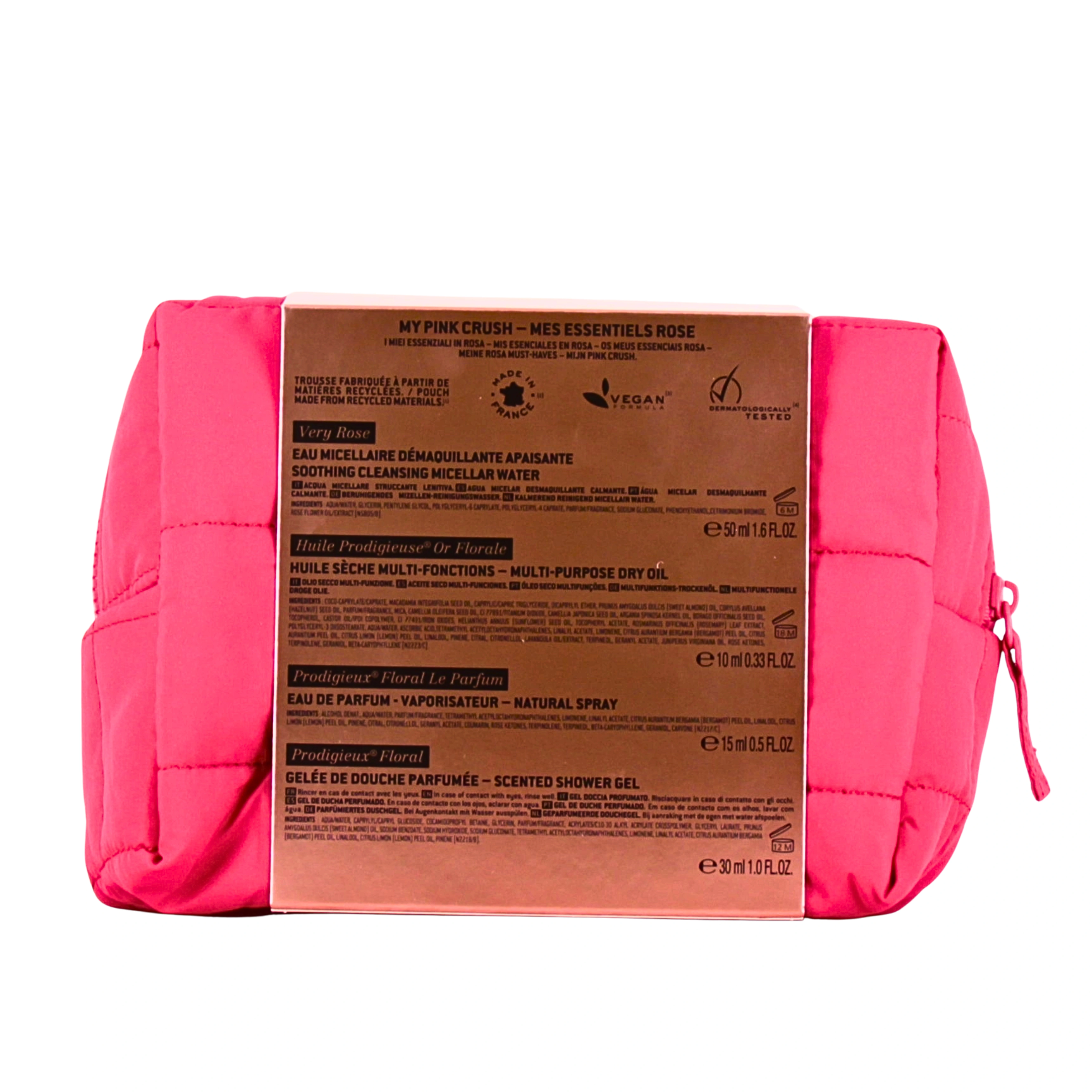 La trousse My Pink Crush Nuxe 2026 contient également l'eau micellaire Very Rose ainsi que l'huile Prodigieuse Or Florale. Ces soins sont accompagnés de :