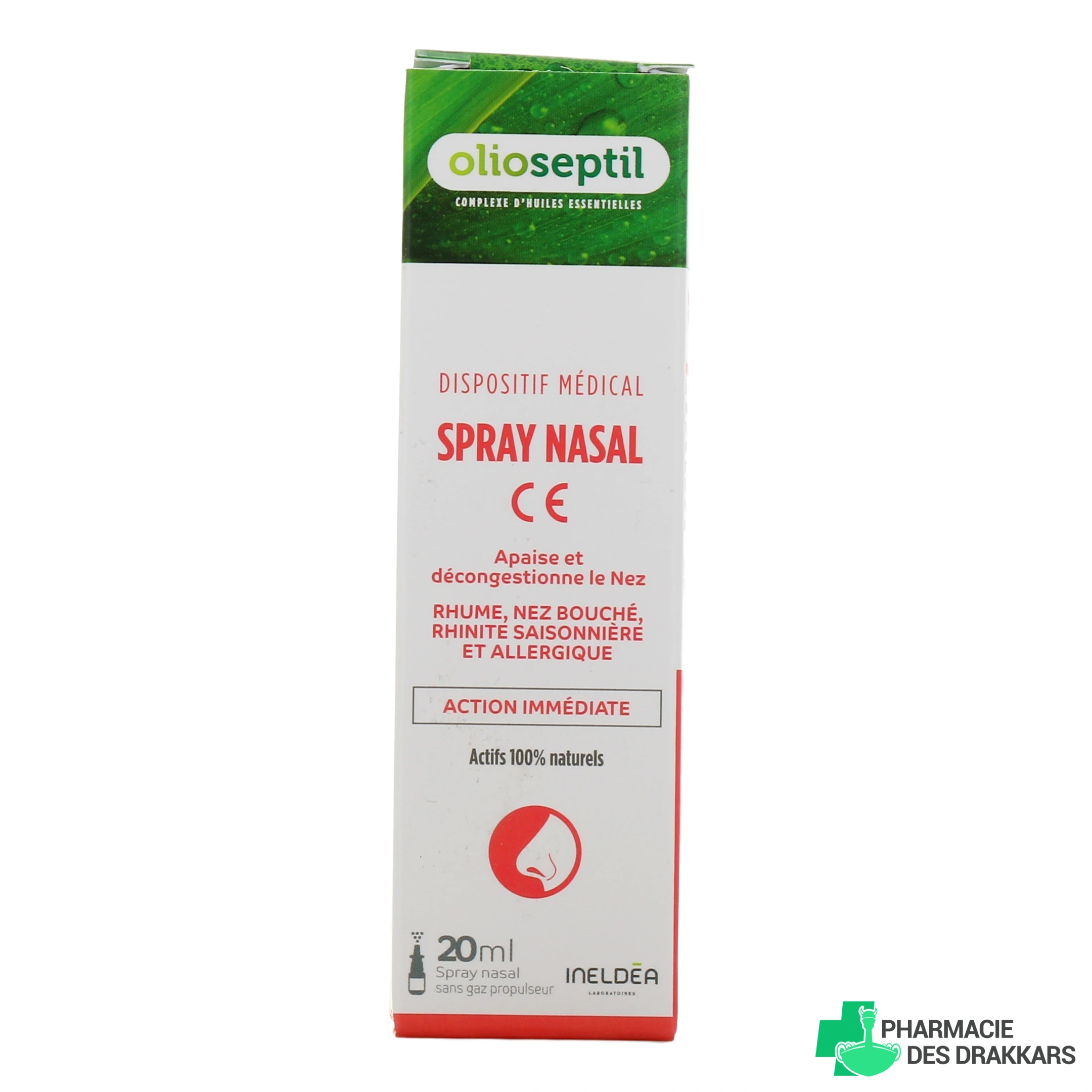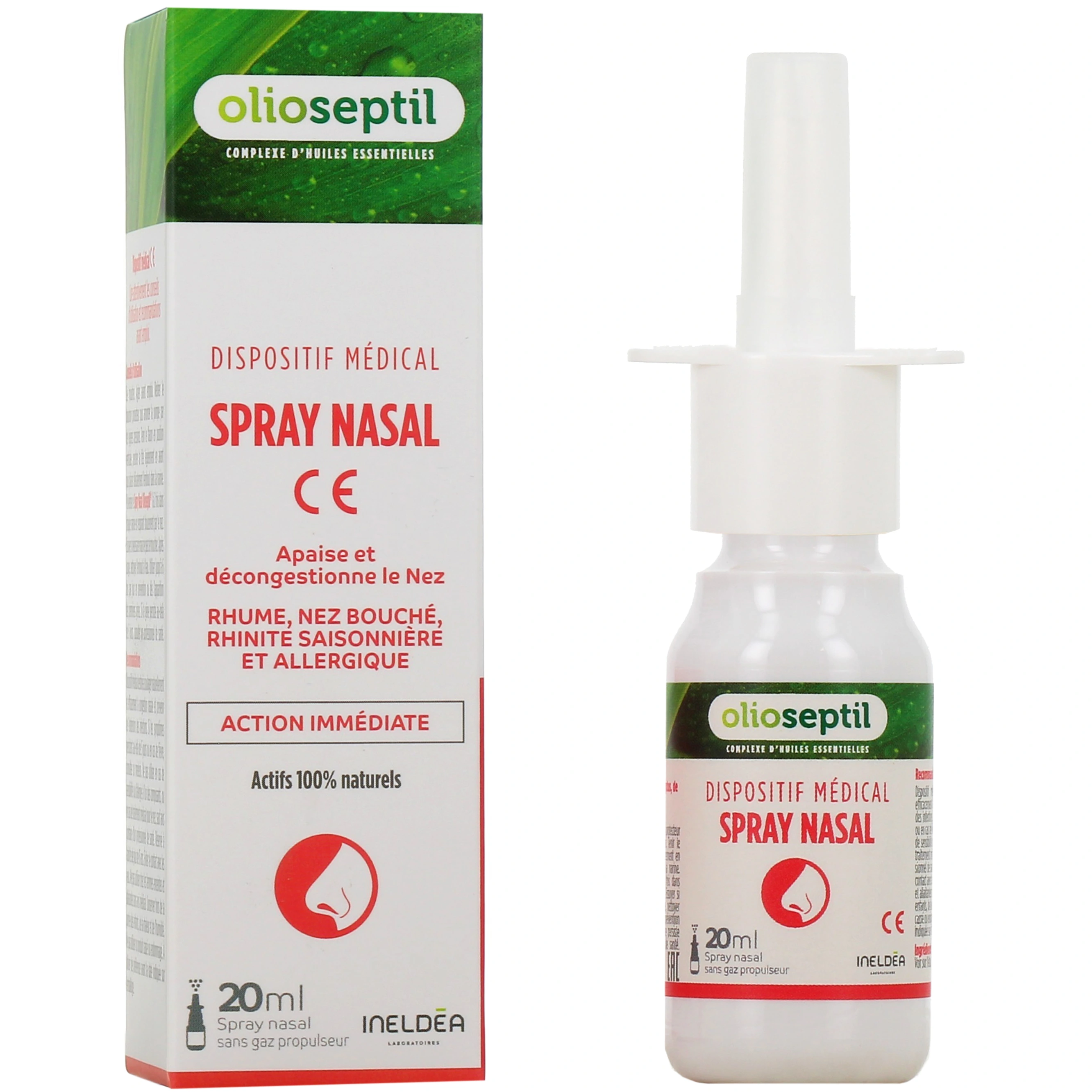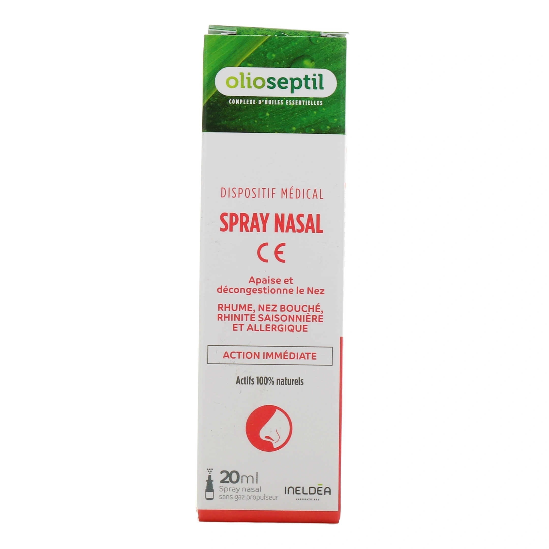 Le spray nasal Olioseptil est un spray formulé à base de sel de la Mer Morte (qui fluidifie les mucosités et réduit le gonflement des sinus), d'eau florale d'eucalyptus Bio, de propolis et d'huiles essentielles de thym et de menthe, qui apportent un agréable parfum frais et rafraîchissant