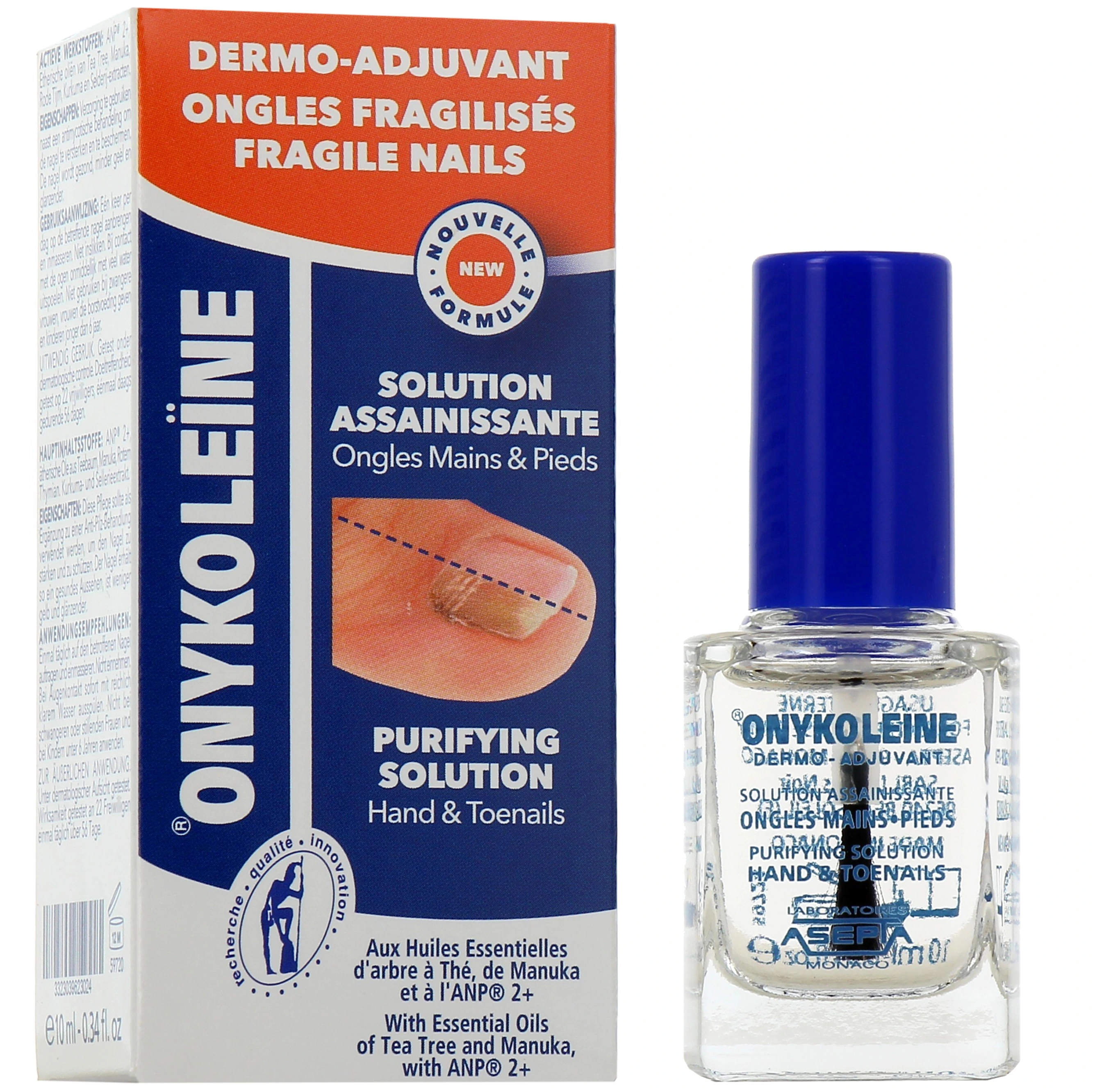 Convenant aussi bien pour les ongles des mains ou des orteils fragiles et / ou jaunis, la solution assainissante Onykoleïne Ongles Fragilisés est destinée à soutenir la repousse du ou des ongles concernés, tout en apportant une action anti-fongique. Sa formule est élaborée à partir d'huiles essentielles d’arbre à thé, de thym rouge, de Manuka, et d'ANP (Activateur Naturel des Phanères), afin de stimuler la protection de kératine et ainsi favoriser la repousse de l'ongle, mais aussi pour déposer sur vos ongles un milieu défavorable à la prolifération des champignons à l'origine de la mycose.