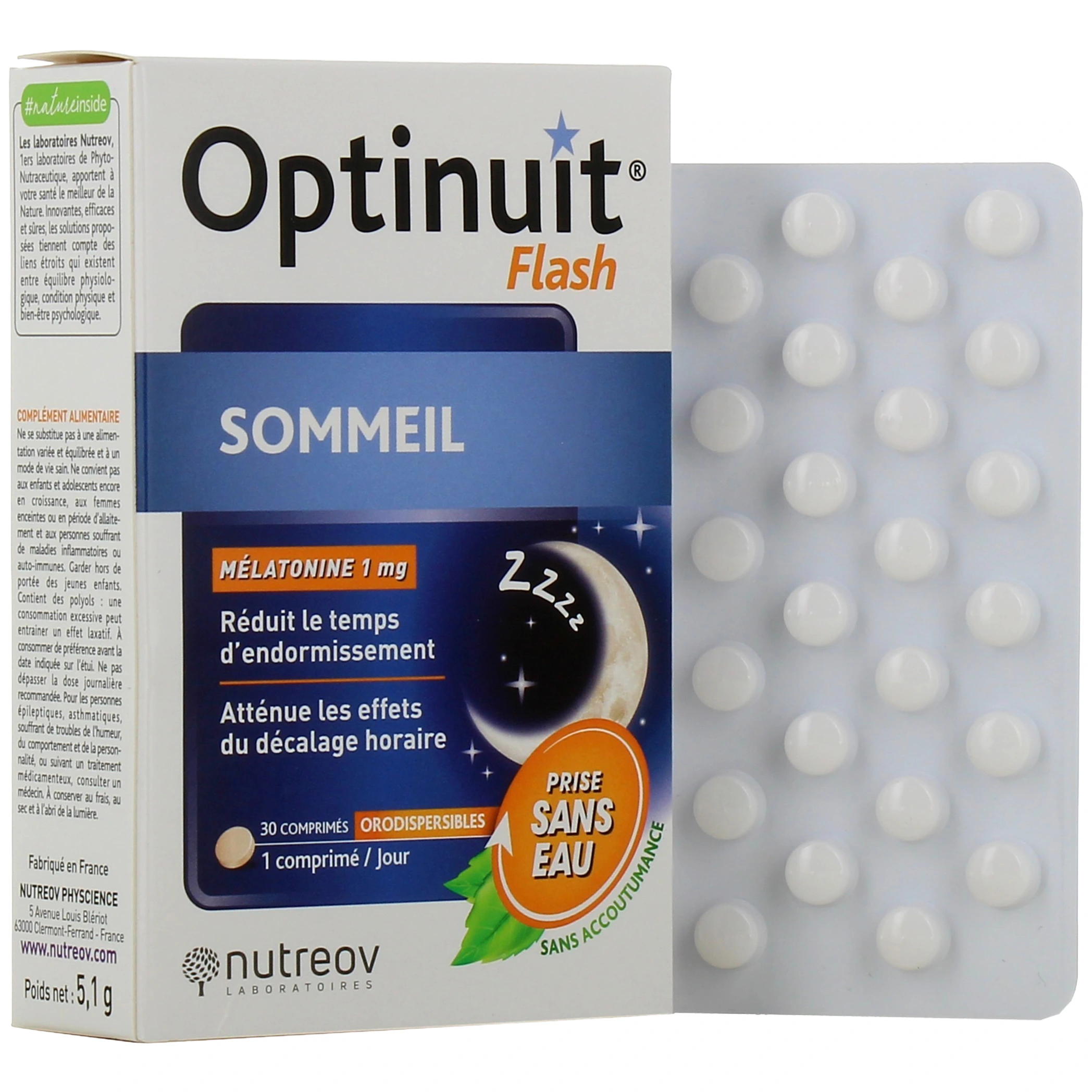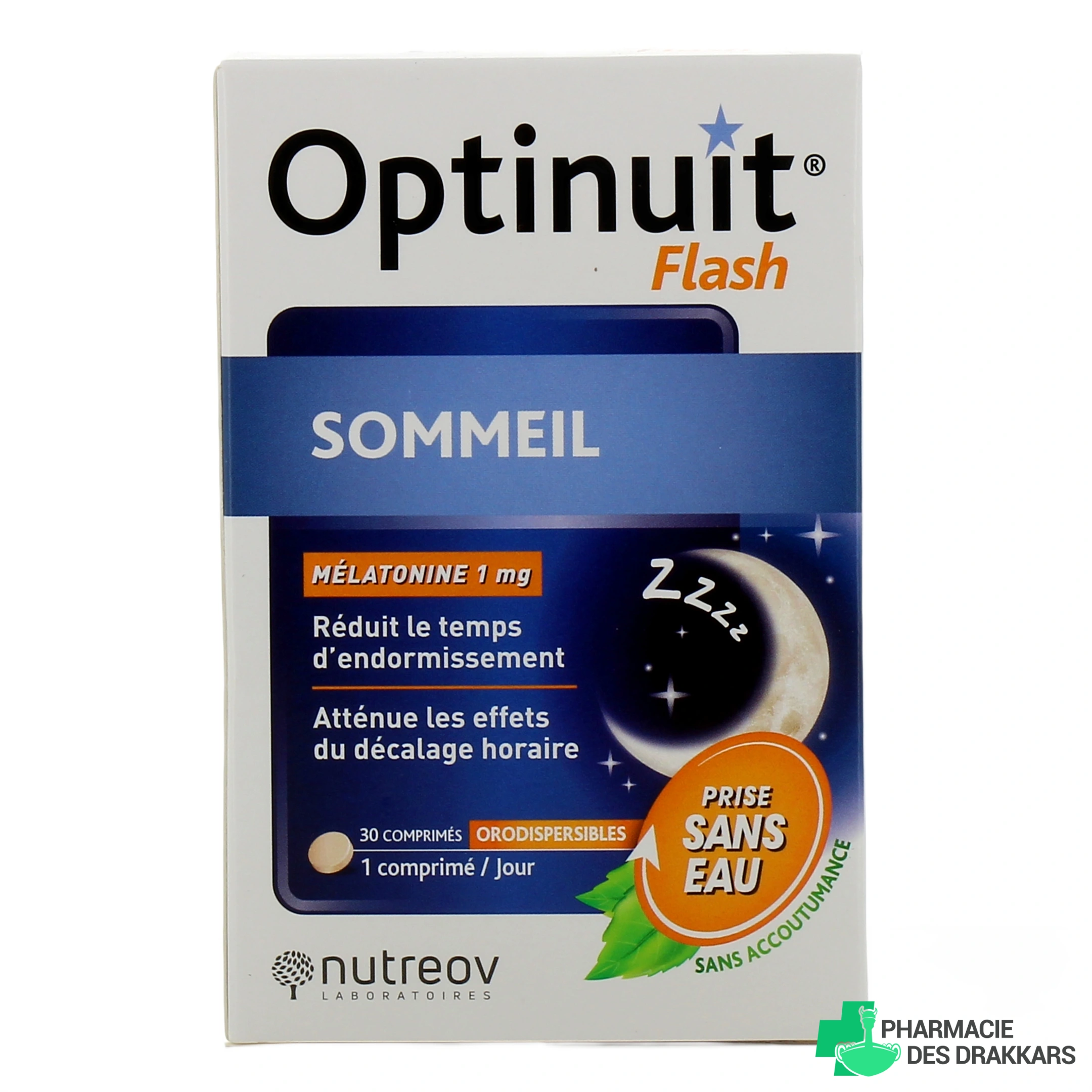 Sous forme de comprimés orodispersibles à prendre sans eau, Optinuit Flash est formulé à base de mélatonine. Il est conseillé pour favoriser un endormissement plus rapide et pour diminuer les effets du décalage horaire, en cas d'horaires décalés dus au travail, ou de jet-lag.
