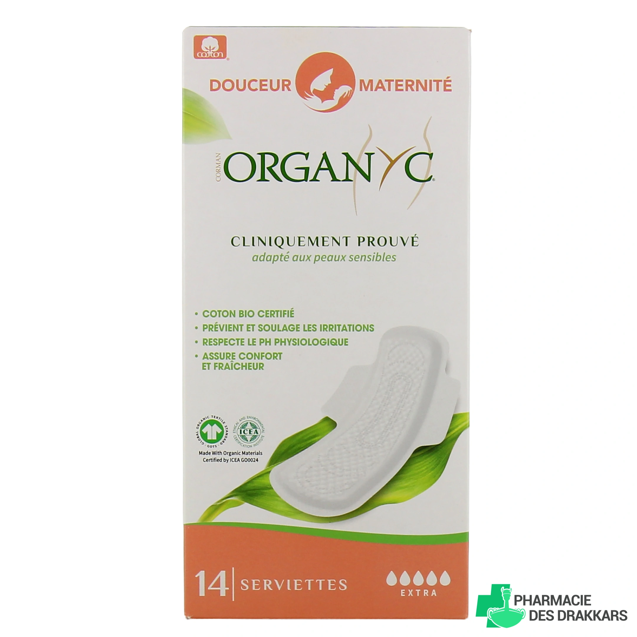 Présentation disponible pour les serviettes douceur maternité Organyc sur notre pharmacie en ligne : Boîte de 10 ou 14 serviettes