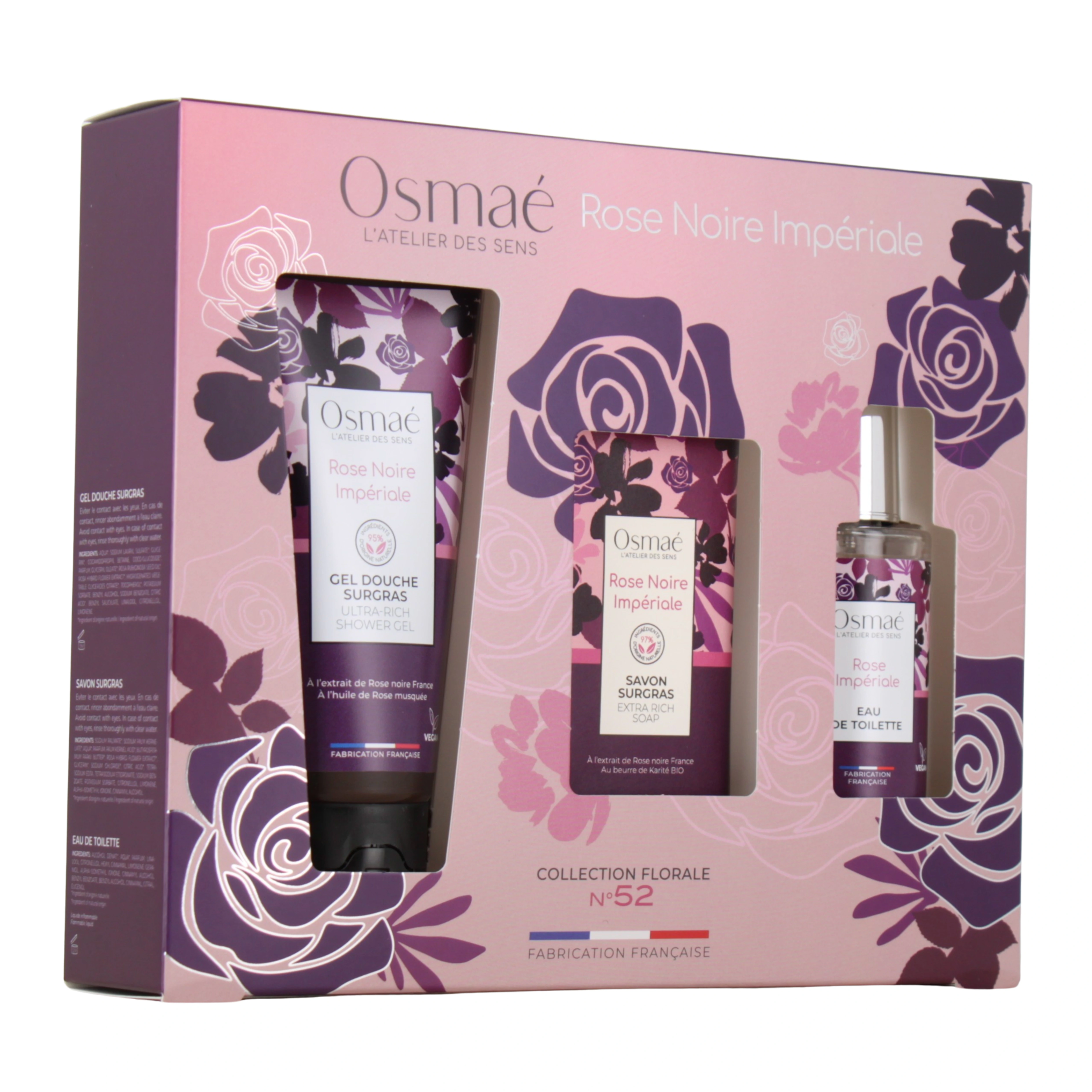 Découvrez toute la noblesse de la fragrance rose noire impériale Osmaé grâce à ce coffret cadeau. Le coffret rose noire impériale Osmaé réunit un trio d'exception : un gel douche surgras, un savon surgras et une eau de toilette au sillage envoûtant. La rose noire, à la fois mystérieuse et sophistiquée, dévoile une alliance parfaite entre sensualité florale et élégance intemporelle.