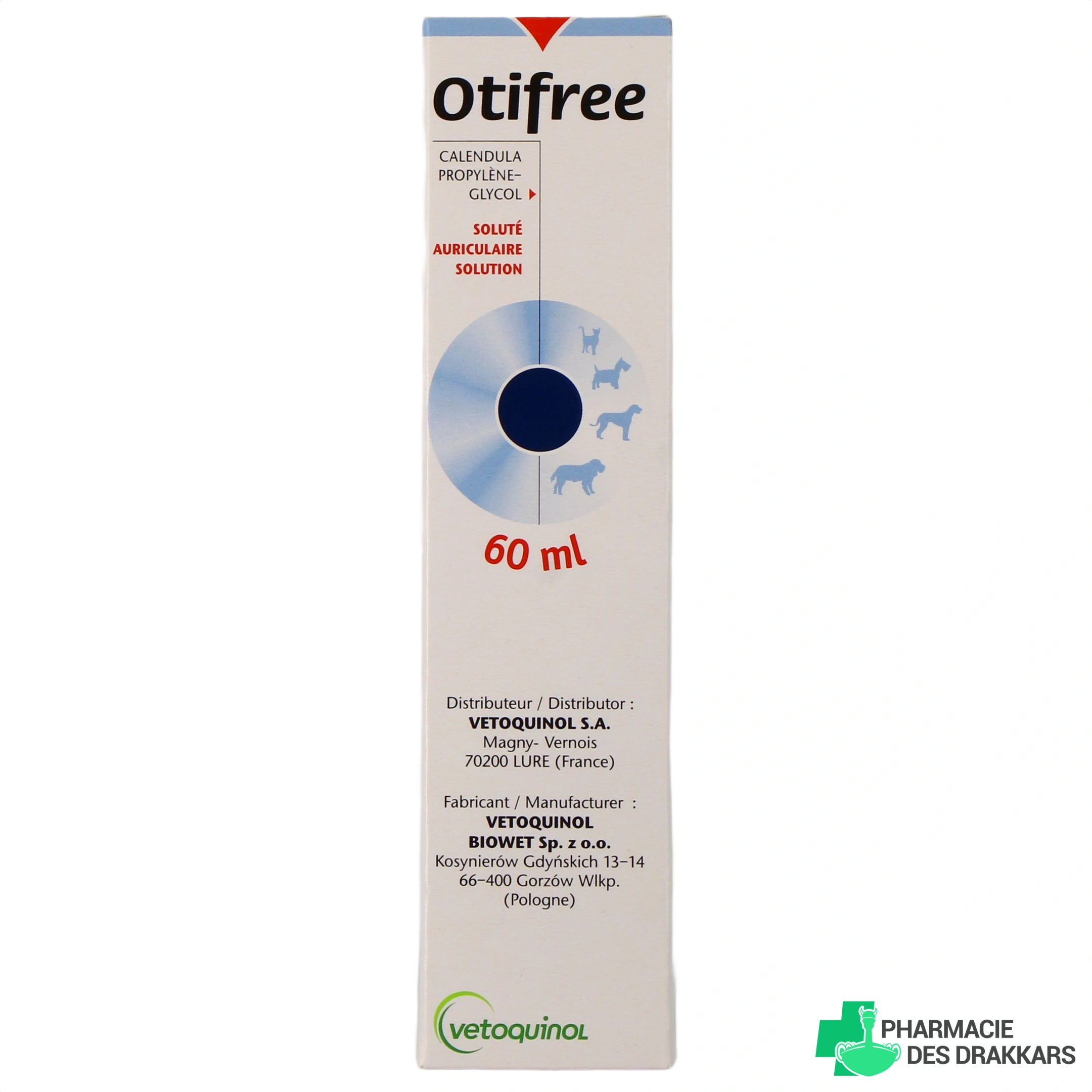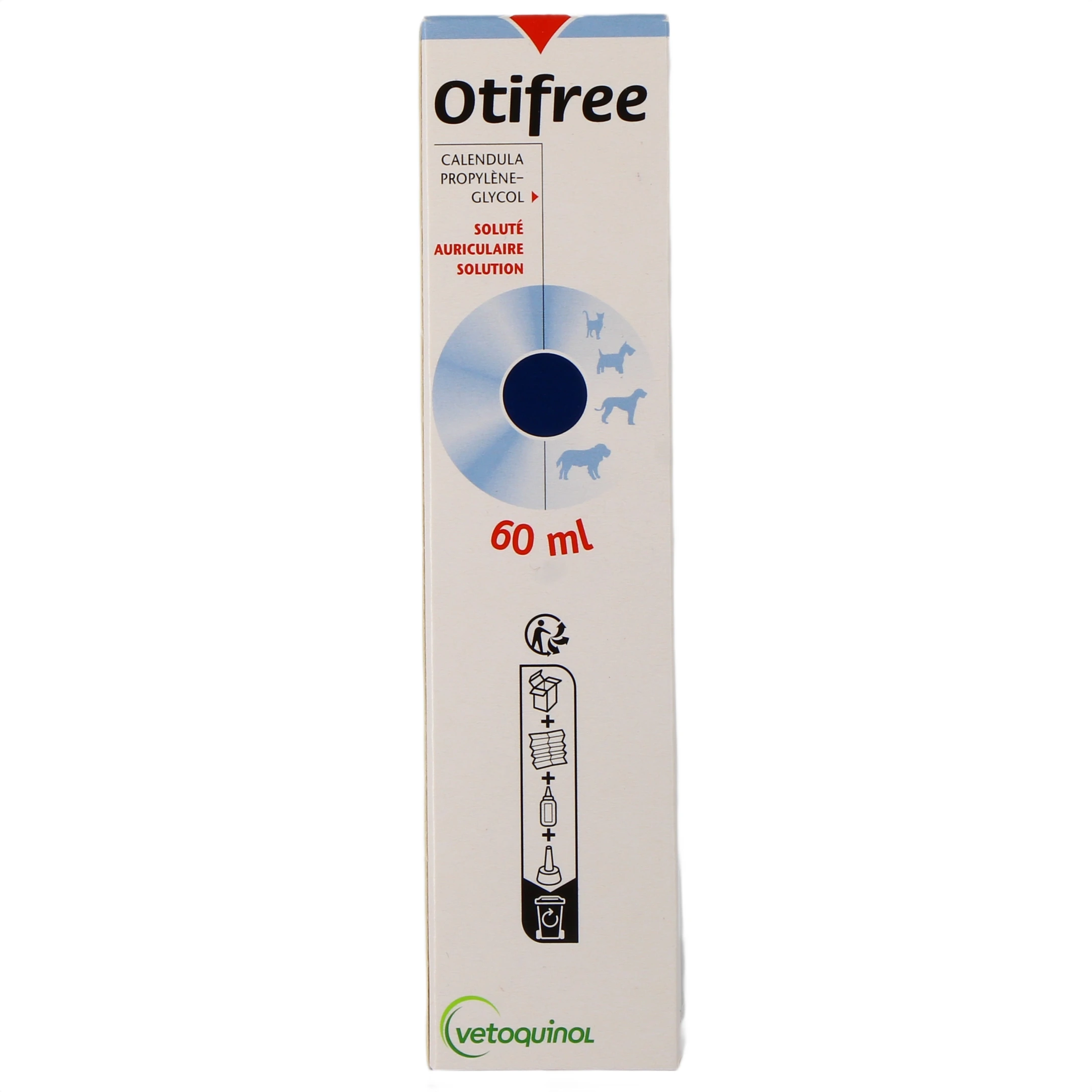 Otifree est un produit vétérinaire du laboratoire Vetoquinol qui prend la forme d'une solution auriculaire, et formulée pour le nettoyage et le soin des oreilles des chiens et des chats.