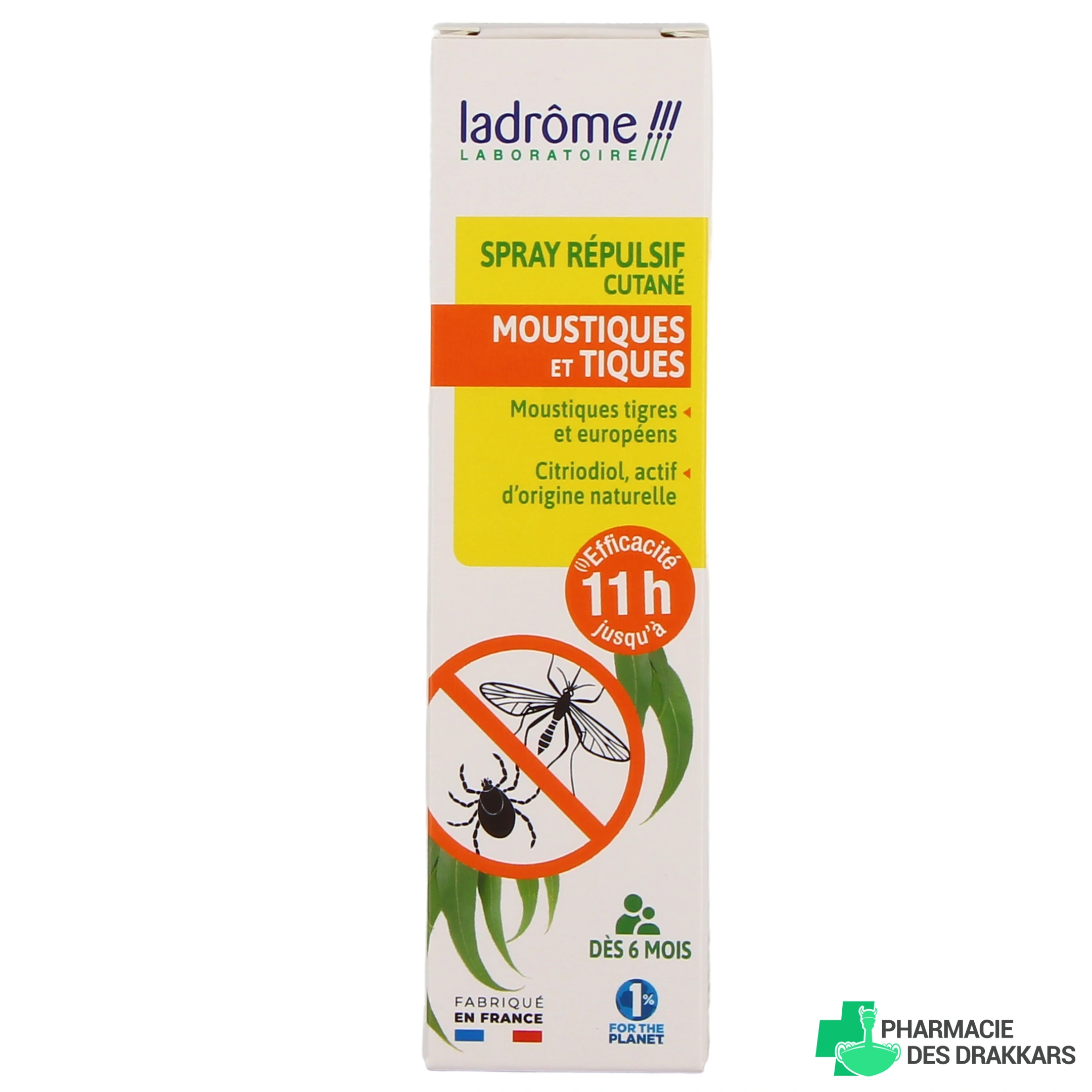 Conditionnement proposé par la Pharmacie des Drakkars pour le spray anti-moustiques Ladrôme : flacon spray de 50 ou de 100 ml.