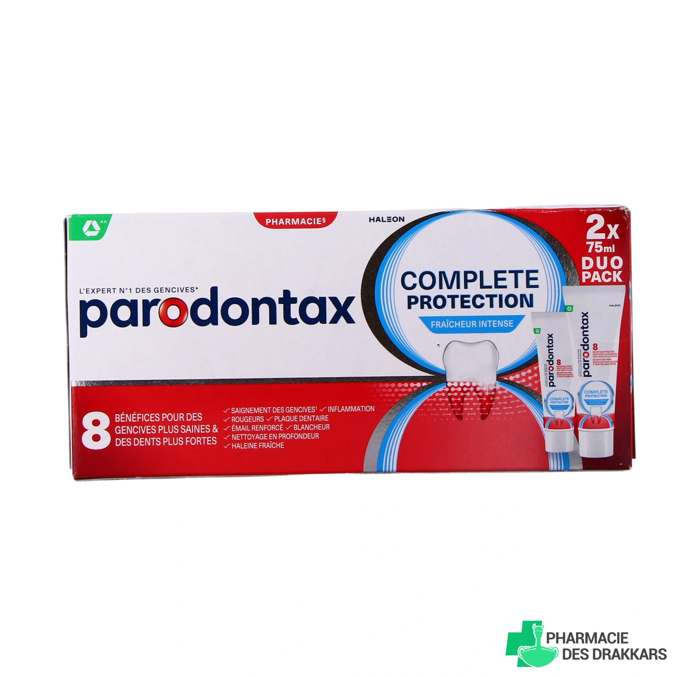 Conditionnements proposés par la Pharmacie des Drakkars pour le dentifrice Parodontax Complete Protection : Tube de 75 ml - Lot de 2 tubes de 75 ml.