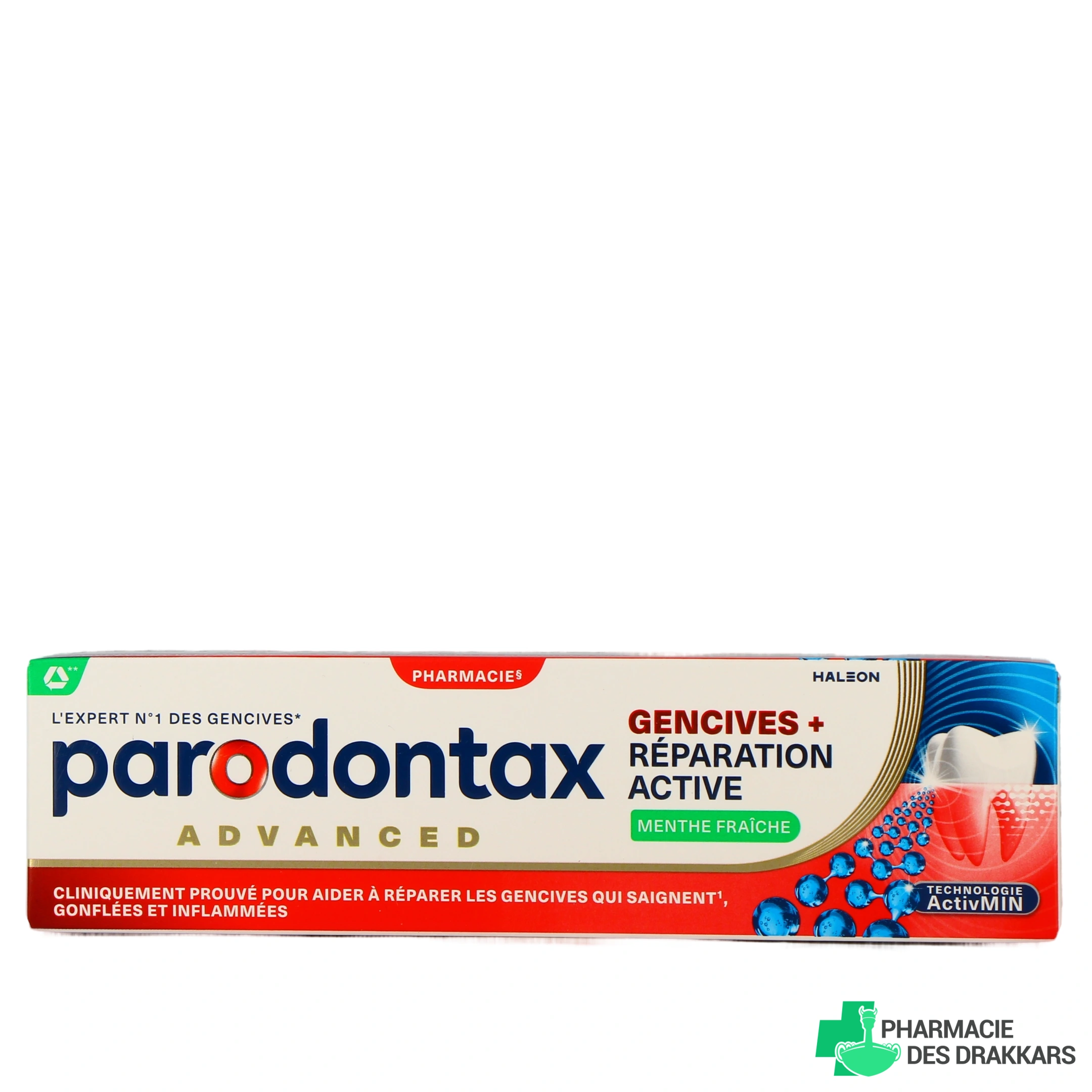 Le dentifrice Parodontax Réparation Active Gencives est un dentifrice au fluor (fluorure de sodium 0,310% p/p (soit 1400 ppm de fluor), adapté à un usage au quotidien, et spécialement formulé pour vous aider à retrouver des gencives saines et des dents plus fortes. Mis au point par le laboratoire GSK, il est proposé avec un arôme de menthe fraîche.