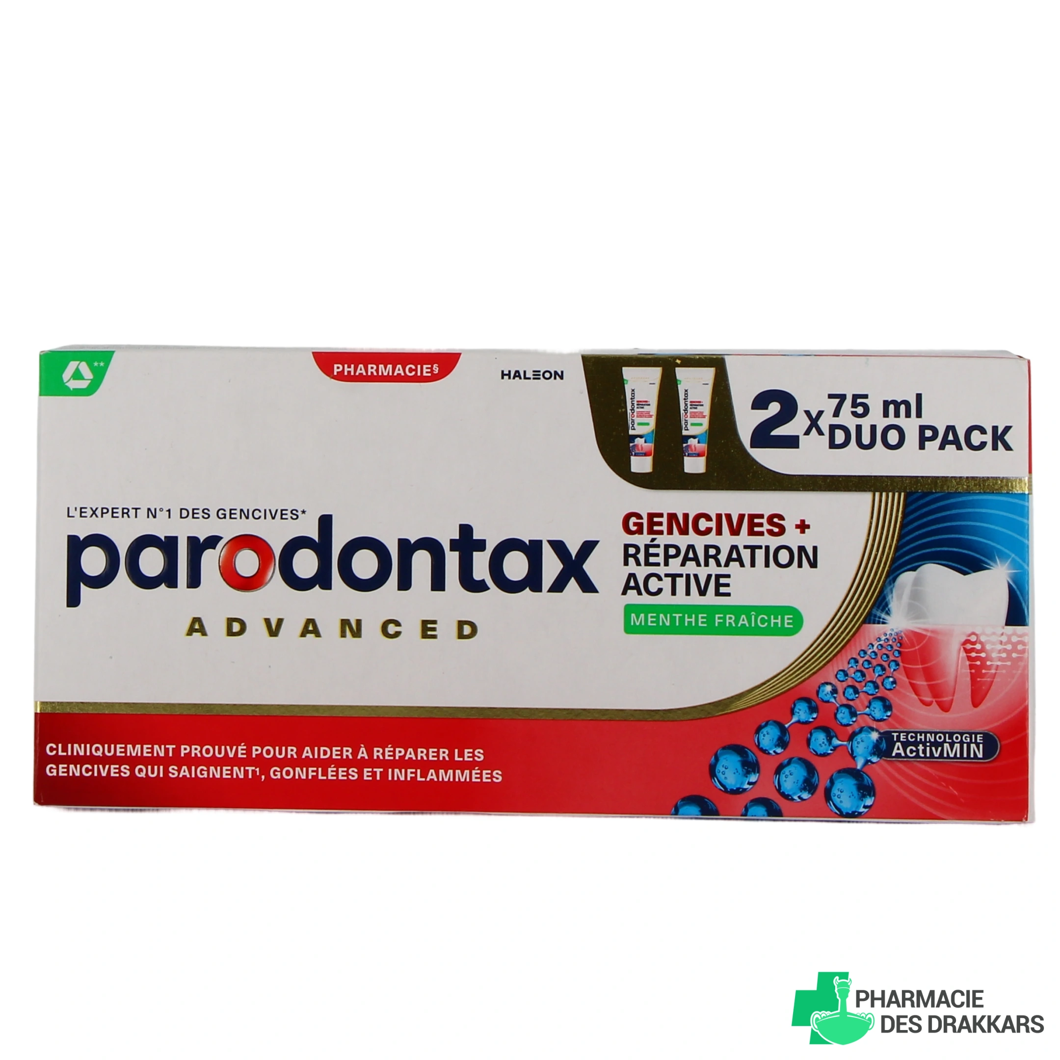 Vous pourrez sélectionner le dentifrice Réparation Active Gencives Parodontax parmi les présentations suivantes sur notre pharmacie en ligne : tube de 75 ml, ou lot de 2 tubes de 75 ml.