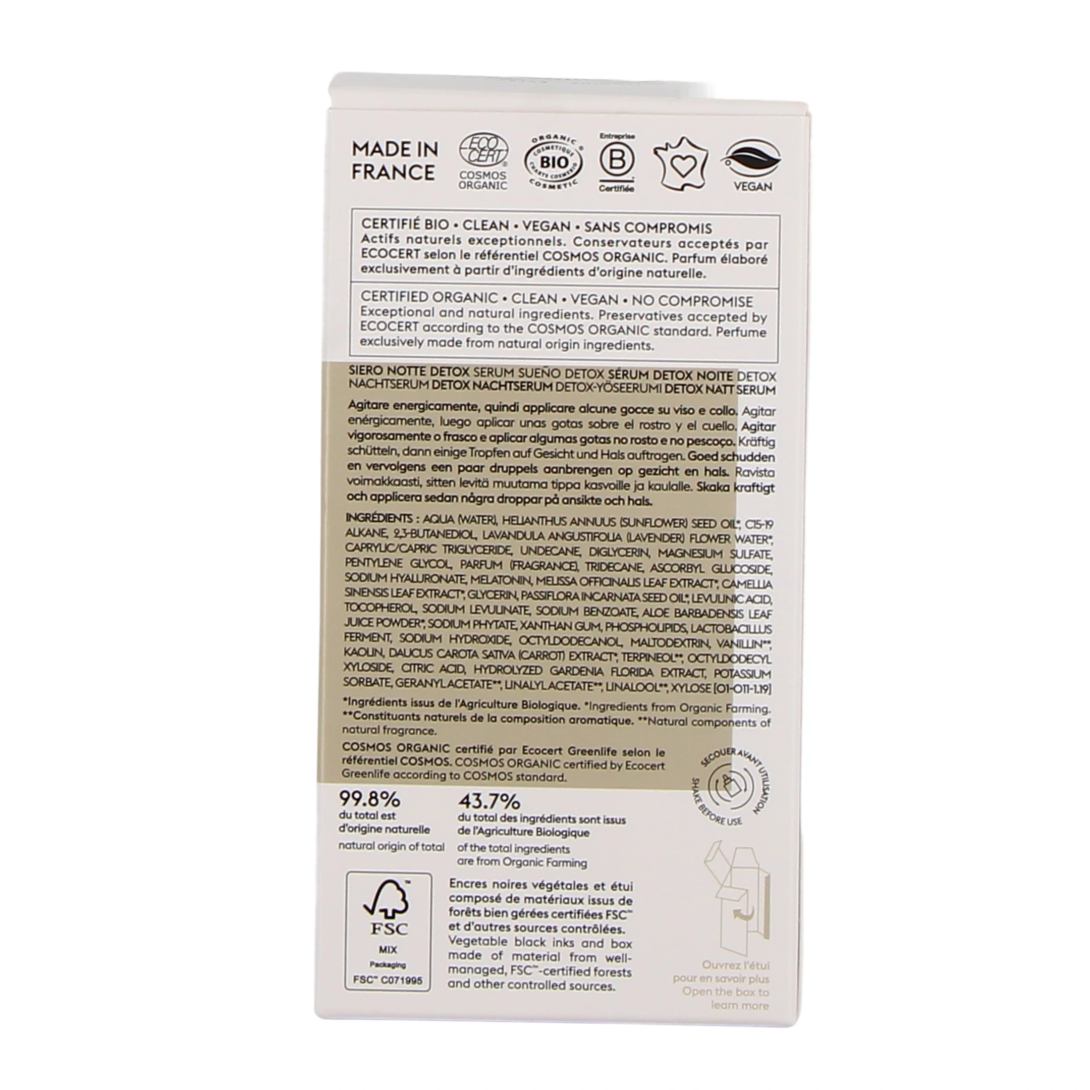 Au cœur de la formule de ce sérum nuit Patyka, deux actifs complémentaires aux puissantes propriétés antioxydantes assurent une régénération optimale. La mélatonine végétale encapsulée booste les mécanismes de récupération nocturne et neutralise les toxines oxydantes. L’extrait de matcha bio, riche en polyphénols, renforce l’action détox. En parallèle, l’association de vitamine Cg, d’acide hyaluronique et d’un extrait de mélisse bio hydrate intensément, stimule le renouvellement cellulaire et protège la peau du stress quotidien.