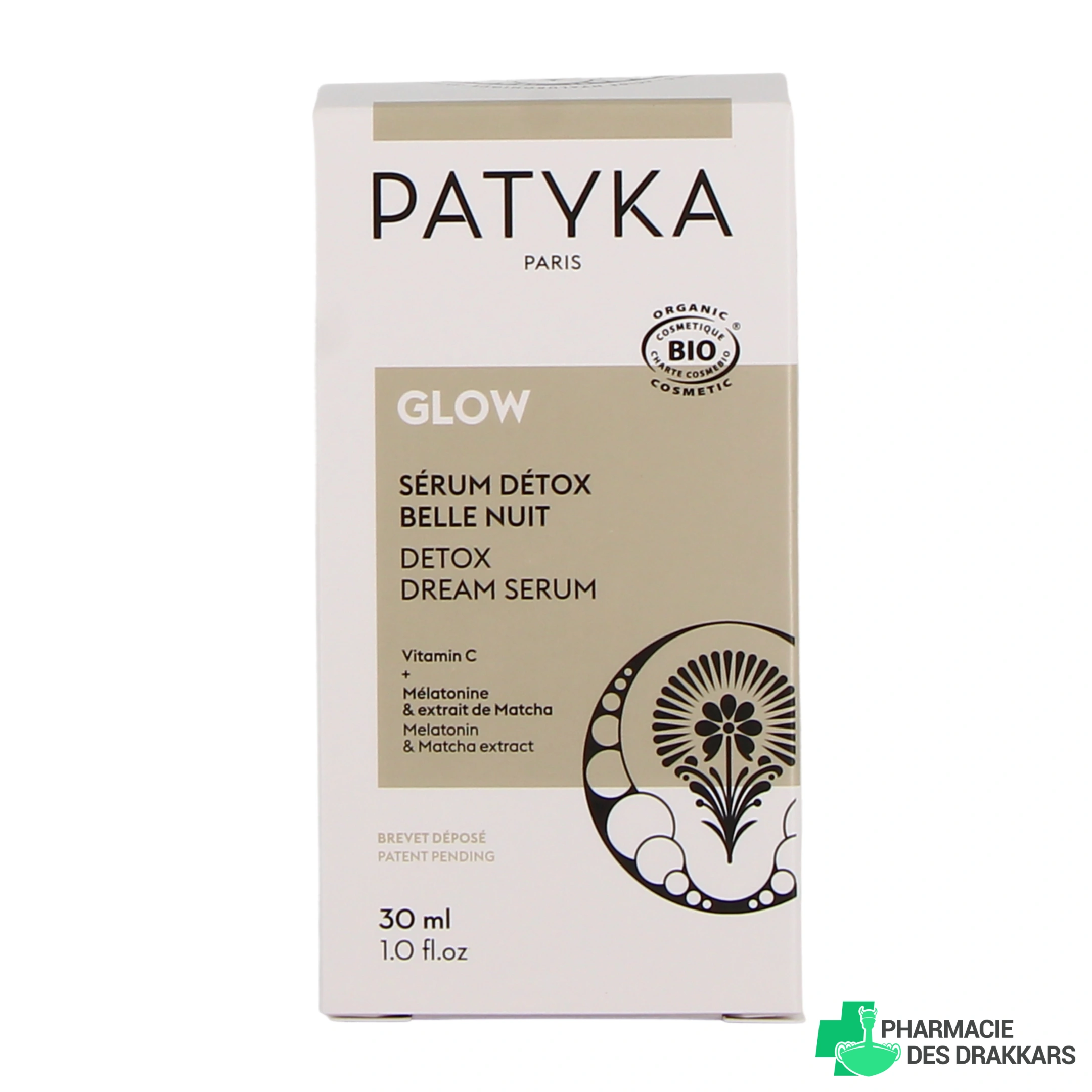 Présentation proposée sur notre pharmacie en ligne pour le sérum détox belle nuit Patyka Glow : flacon-pipette de 30 ml.