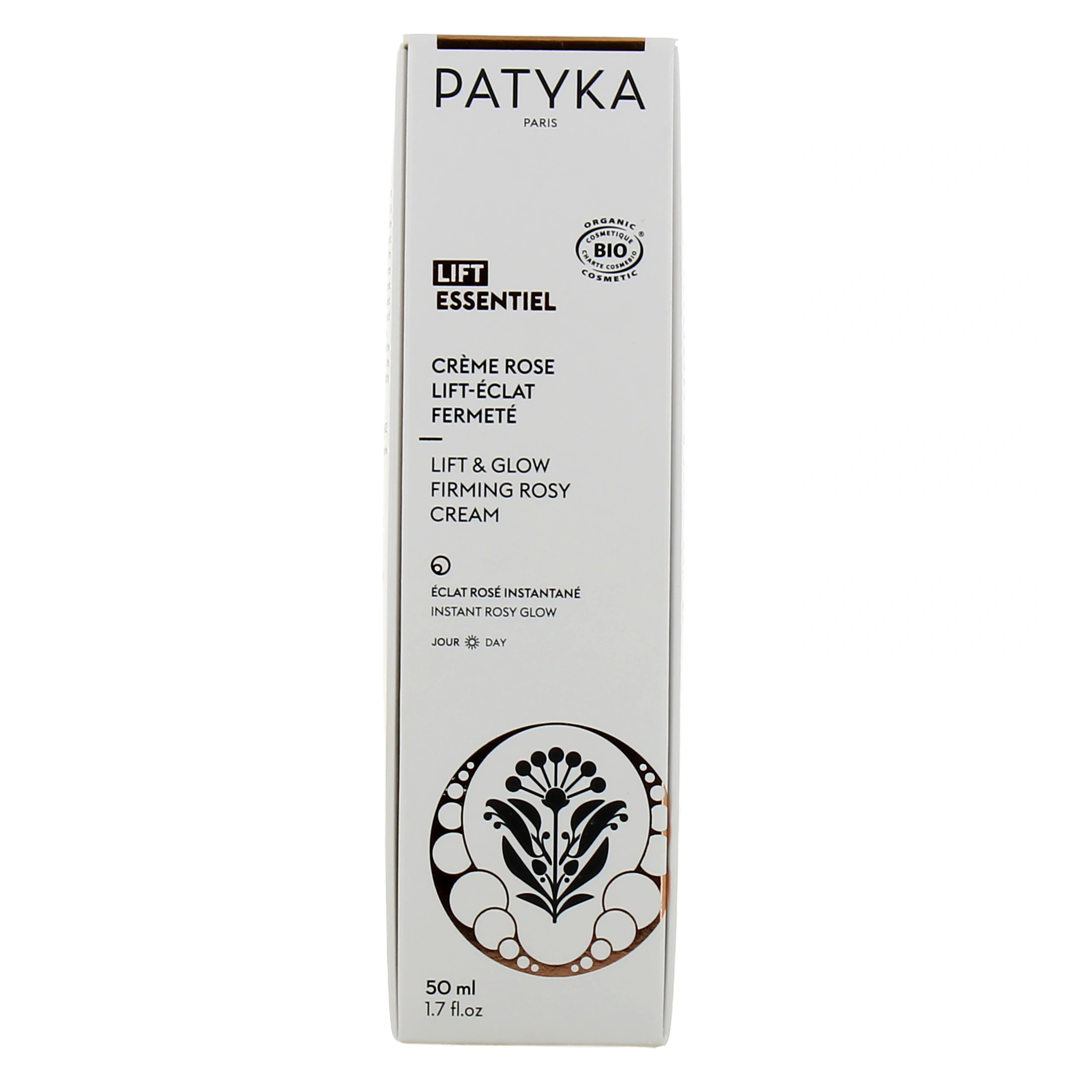 Présentation proposée pour la crème rose lift-éclat fermeté Lift Essentiel Patyka sur notre pharmacie en ligne : Flacon-pompe airless de 50 ml
