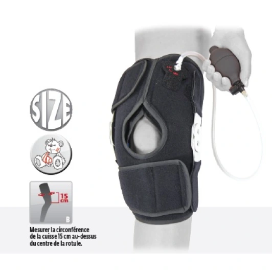 Proposée en 2 tailles (Standard ou XL, référez-vous à l'onglet "Guide des Tailles") et adaptable à toutes les morphologies, l'attelle de genou articulée Perform'Ice propose une double action de compression et de cryothérapie : elle est en effet fournie avec un pack de froid amovible, qui permet une application externe localisée de traitement par le froid. La genouillère articulée Perform'Ice dispose également d'une housse gonflable avec pompe manuelle pour ajouter un effet compressif. Elle est simple à mettre en place grâce à sa structure enveloppante, et les baleines latérales amovibles permettent un maintien supplémentaire. Elles peuvent être retirées en phase de réhabilitation pour accompagner le mouvement naturel de l’articulation lors de l’ambulation.