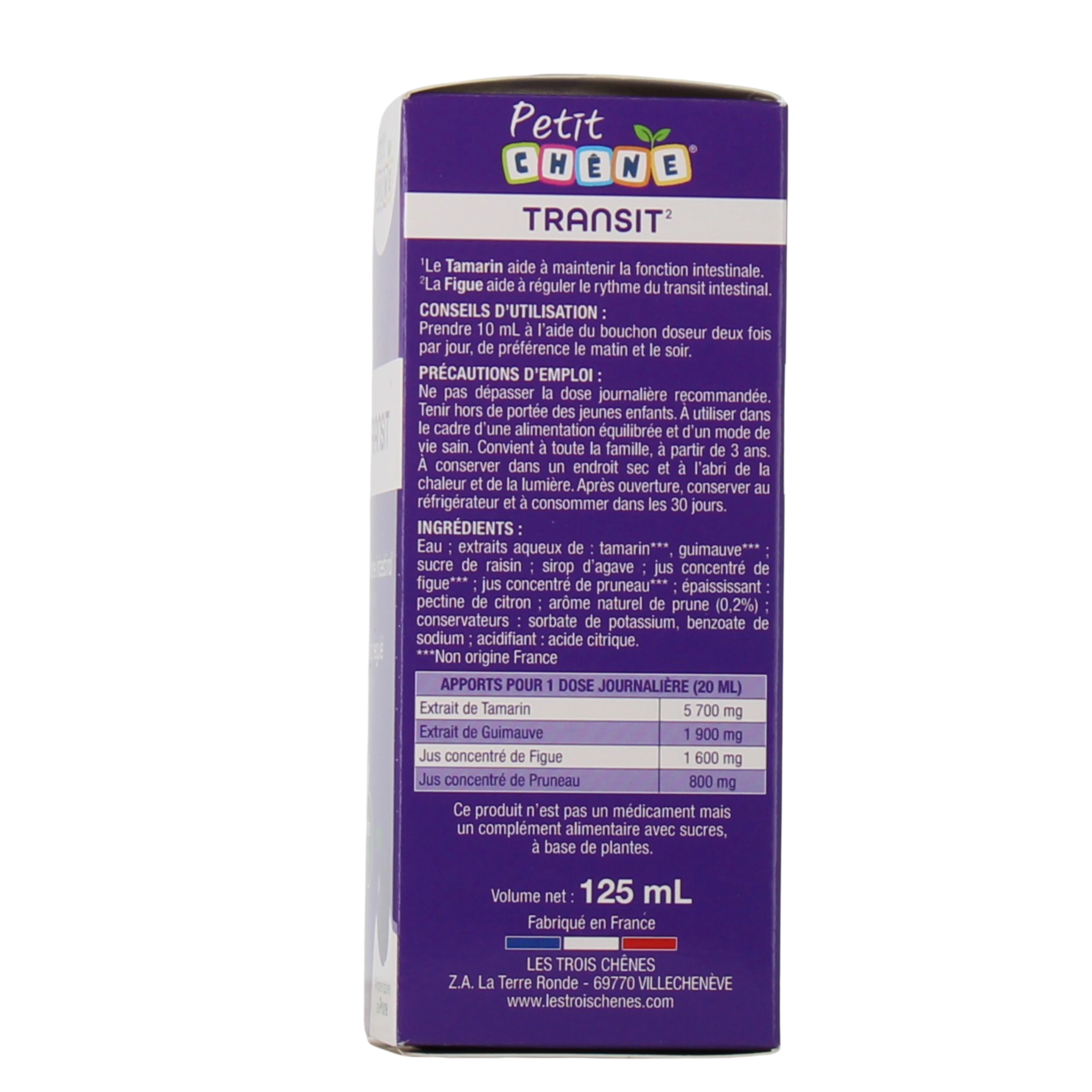 Dans sa formulation, Petit Chêne Transit intègre du Tamarin, qui aide à maintenir la fonction intestinale. La Figue aide quant à elle à réguler le rythme du transit intestinal. La composition intègre également de l'extrait de Guimauve et du jus de Pruneau.