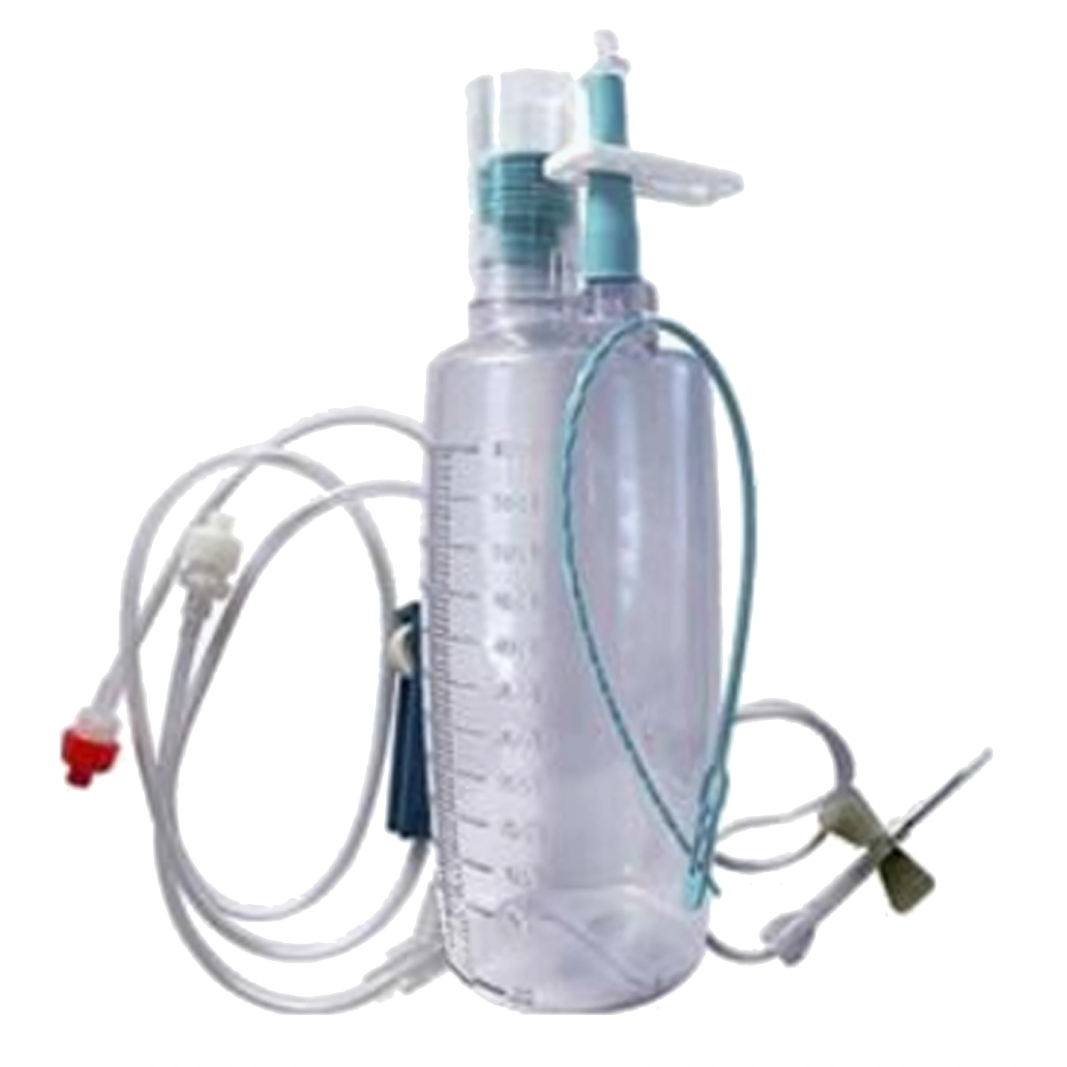 - 1 redon 600 ml (500 ml fonctionnels) sous vide (980 mbar) avec raccord Luer Lock femelle sur sortie souple avec clamp et témoin de vide. Graduation tous les 10 ml