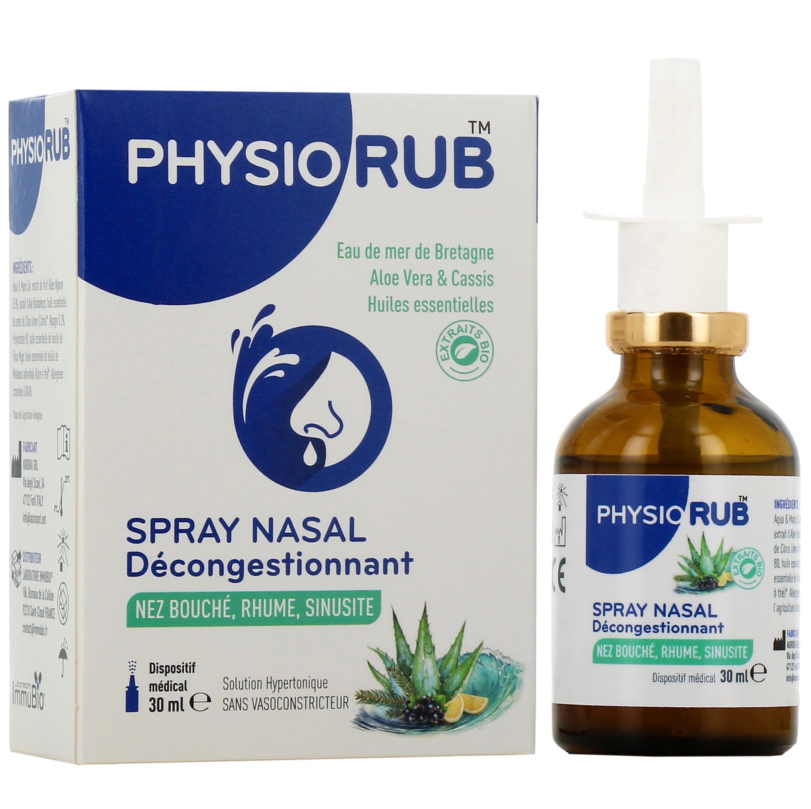 Pour agir localement contre la congestion des muqueuse nasales, les laboratoires Immubio ont développé le spray nasal Physiorub. Composé d'eau de mer de bretagne, d'aloe vera, de cassis et de différentes huiles essentielles, cette solution nettoie en profondeur les fosses nasales et soulage le nez bouché.