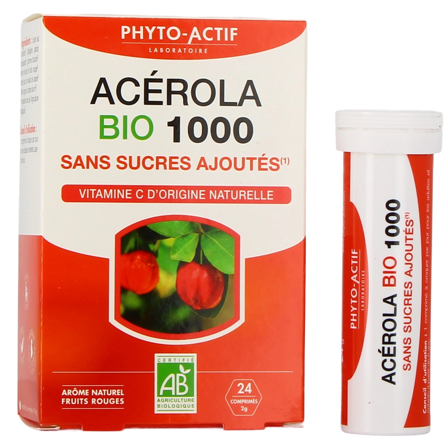 Phyto-Actif Acerola 1000 Bio est un complément alimentaire sous forme de comprimés à croquer. Il apporte de la vitamine C d'origine naturelle pour aider à réduire la fatigue.