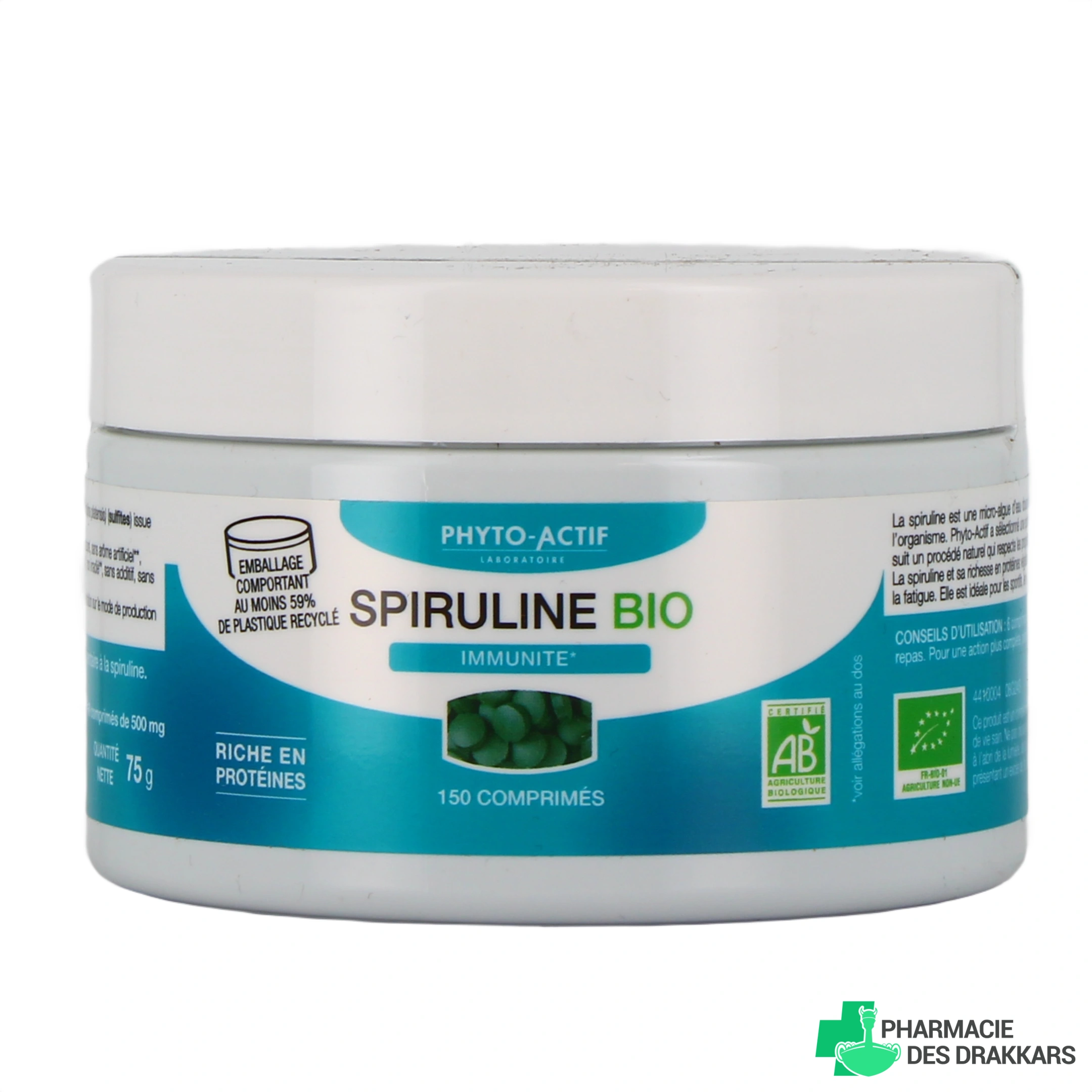 Présentations proposées par votre pharmacie en ligne : pots de 150 ou de 300 comprimés à base de spiruline d'origine biologique.