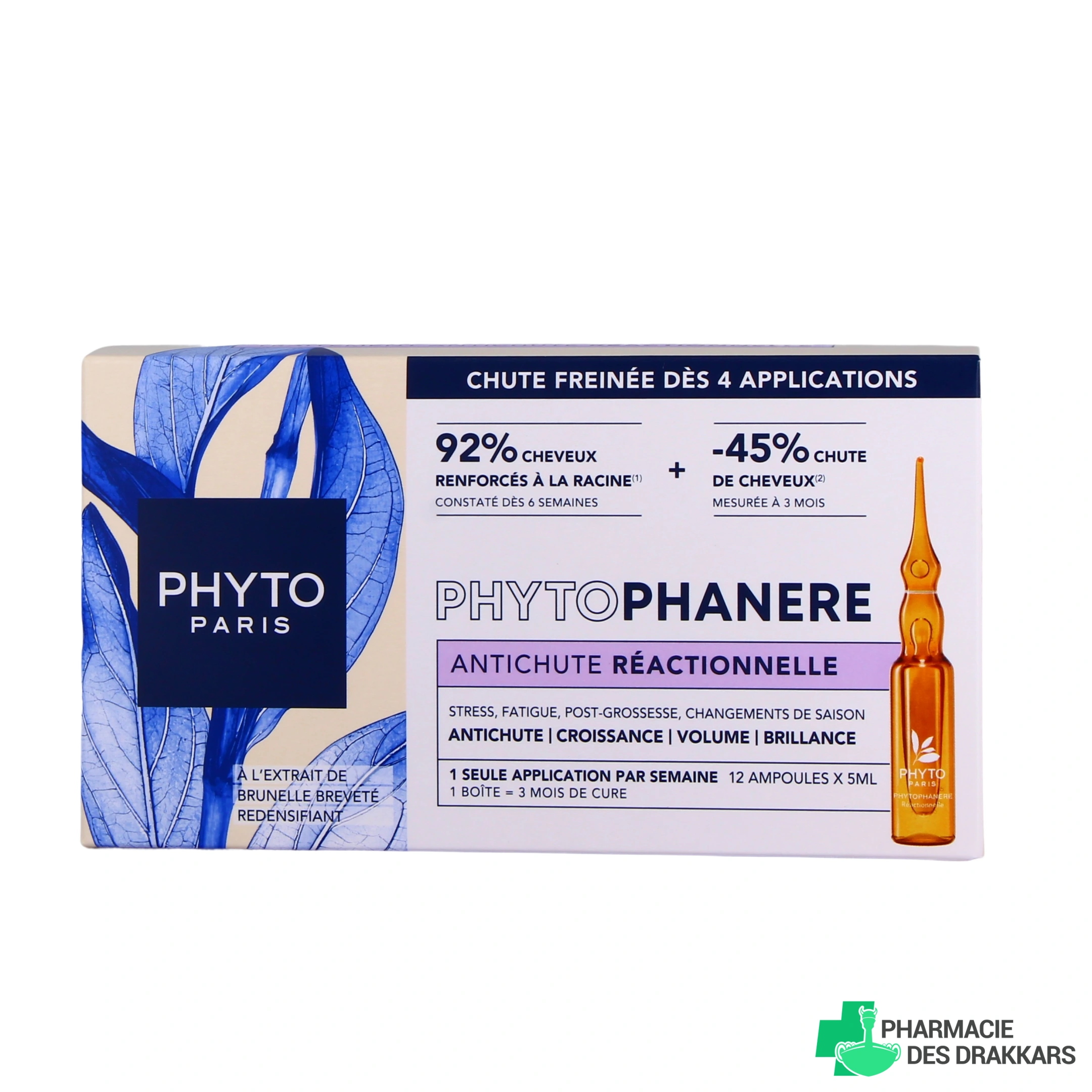 Phytophanere Antichute Réactionnelle est un traitement mis au point par Phyto qui freine efficacement la chute de cheveux soudaine liée au stress, au post-partum ou aux changements de saison. Sa formule concentrée en 4 extraits botaniques brevetés agit dès 4 applications pour réduire visiblement la chute. En 6 semaines, la chevelure paraît plus dense, plus forte et visiblement plus volumineuse.