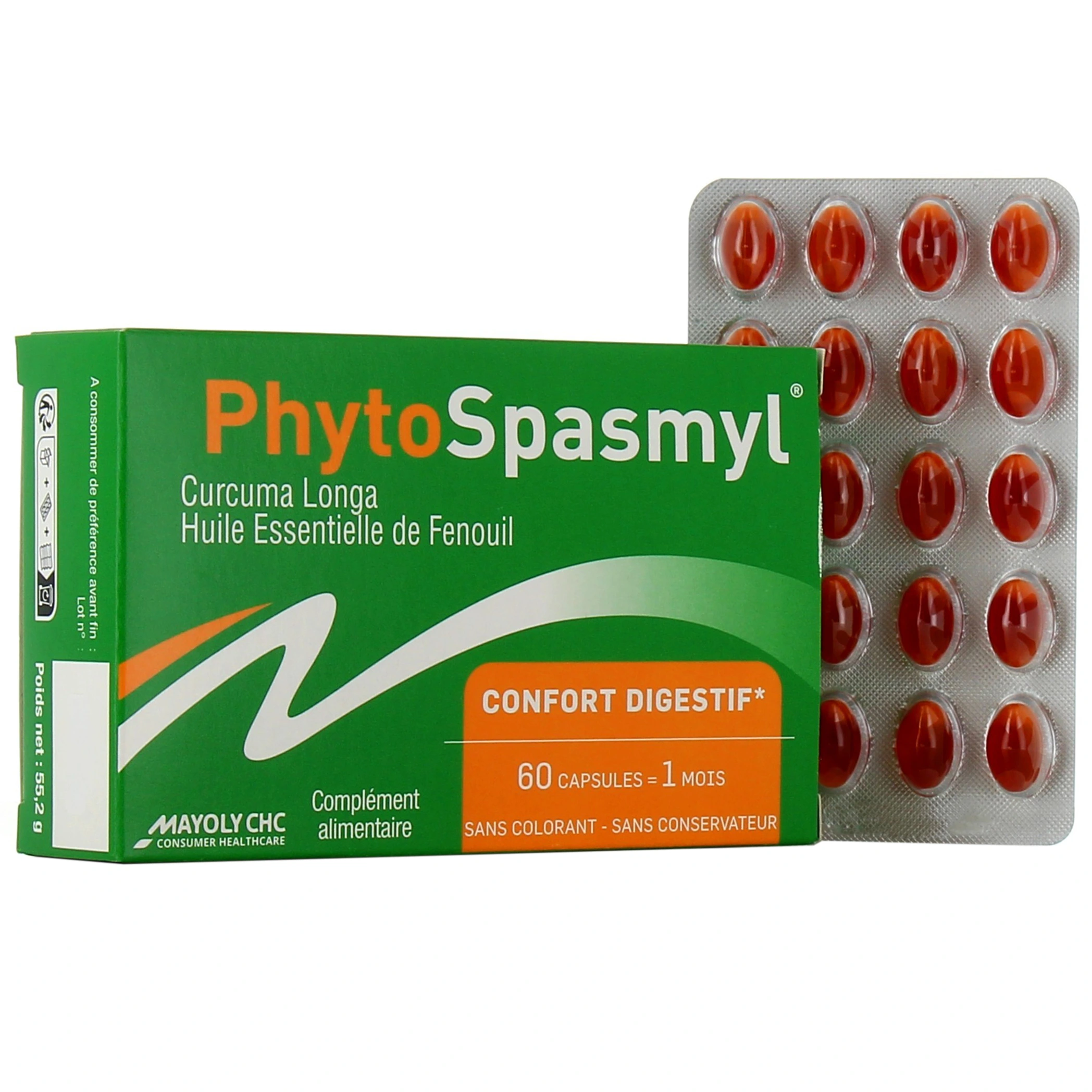 PhytoSpasmyl est un complément alimentaire des laboratoires Mayoly pour le confort digestif, et présenté sous forme de capsules à base de curcuma et d'huile essentielle de fenouil.