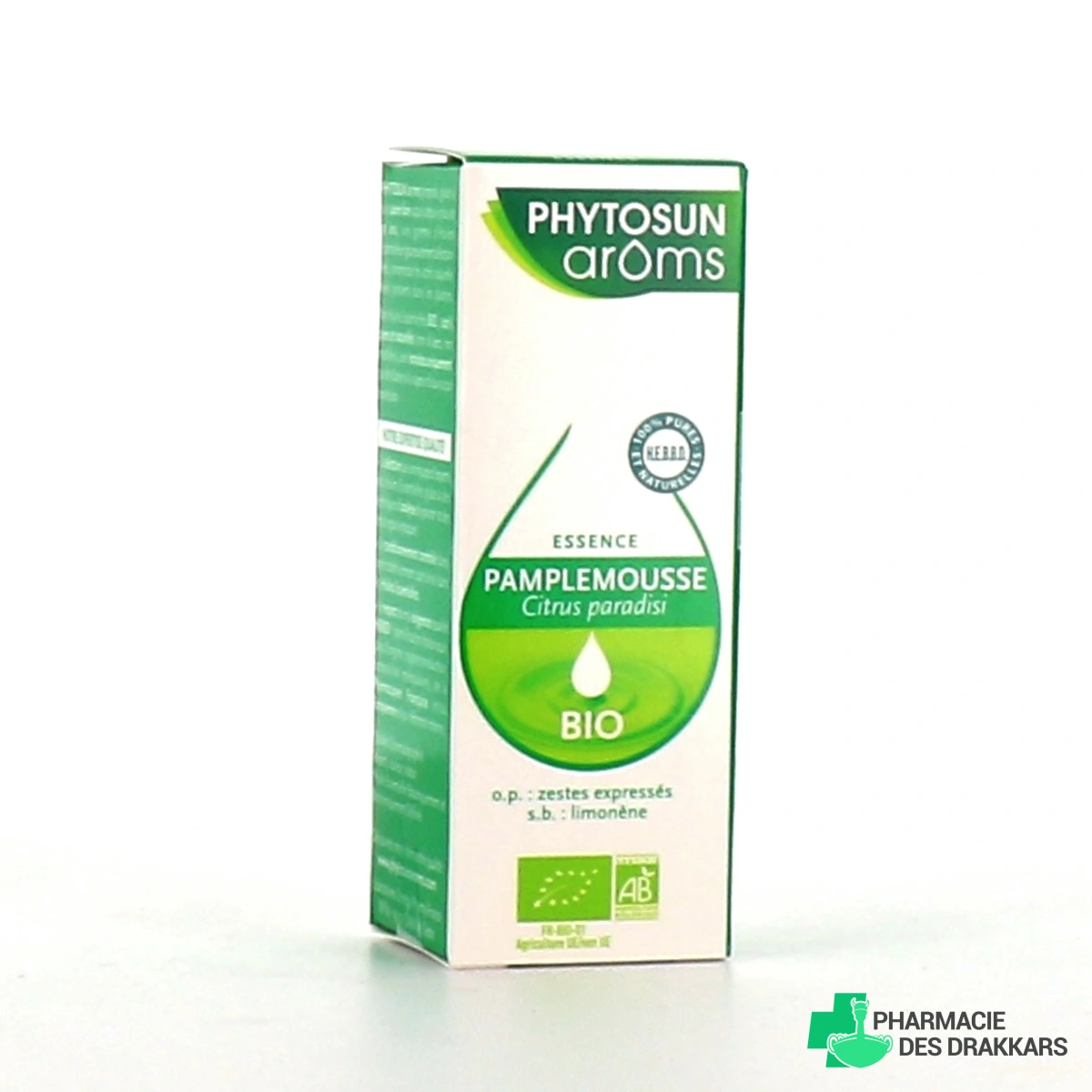 Conditionnement proposé par la Pharmacie des Drakkars pour l'huile essentielle Bio de pamplemousse Phytosun Aroms : Flacon 10 ml.
