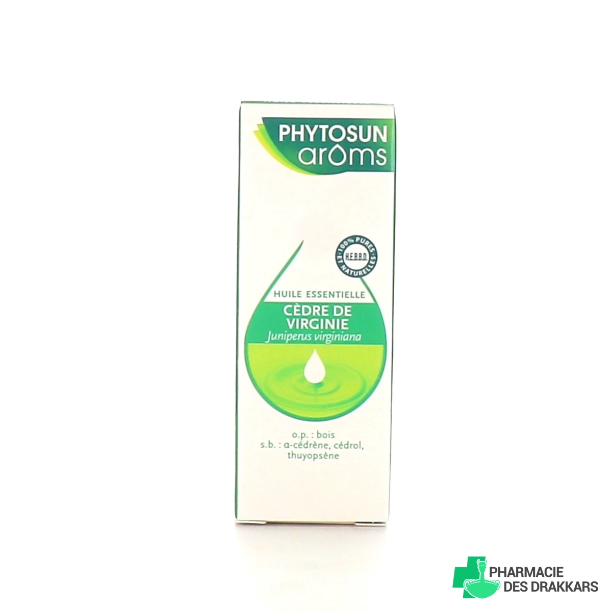 Présentation disponible sur le site internet de la Pharmacie des Drakkars de Phytosun Aroms Huile Essentielle Cèdre de Virginie : flacon de 5 ml.