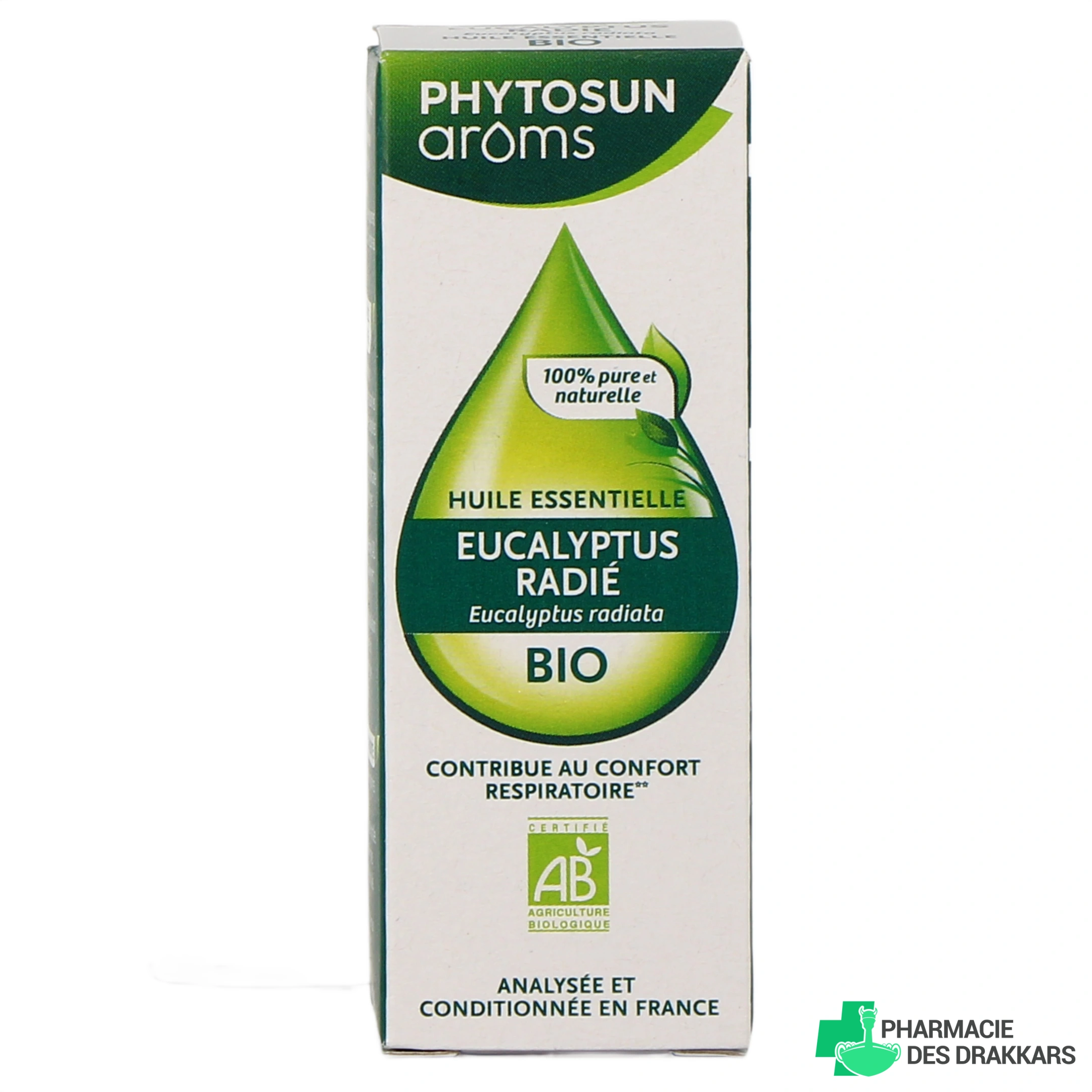 L'Huile Essentielle d'Eucalyptus radié Phytosun Aroms est obtenue par distillation des feuilles d'Eucalyptus radiata issu de l'agriculture biologique. Les molécules obtenues sont le 1,8-cinéole, l'alpha-terpinéol et les citrals.