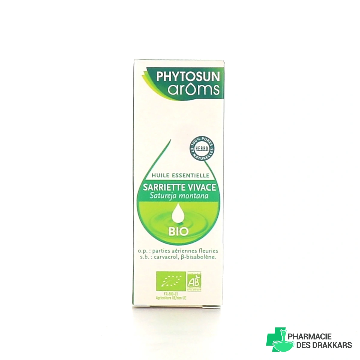 Vous pourrez retrouver cette huile essentielle de Sariette Vivace Bio du laboratoire Phytosun Aroms dans les présentations suivantes sur notre pharmacie en ligne : flacon compte-gouttes de 5 ml.