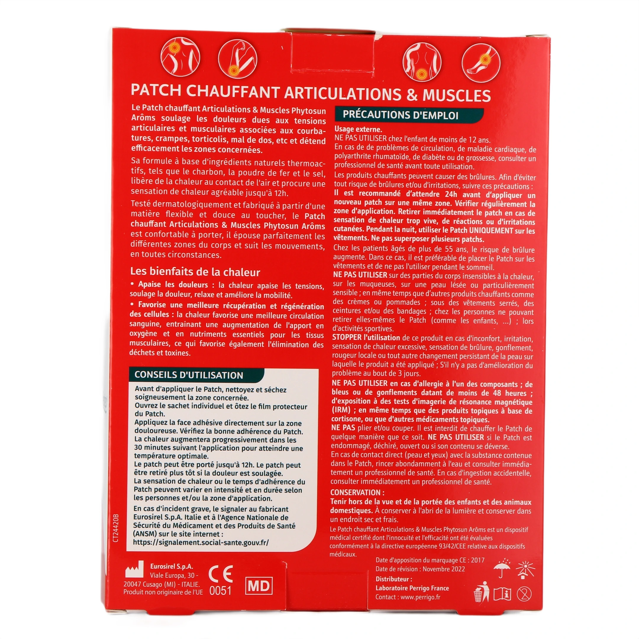 Précautions d'emploi : Usage externe. Ne pas utiliser chez les enfants de moins de 15 ans, ni chez les femmes enceintes ou allaitantes. Les patchs ne doivent pas être appliqués sur des plaies, sur une peau lésée, sur des muqueuses ou sur une peau sensible. Ne pas utiliser en cas d’allergie à l’un des composants. Le patch peut provoquer une rougeur cutanée locale. Si la sensation de chaleur est trop vive ou en cas de réaction ou d’irritation importante, retirer le patch immédiatement. À conserver à l’abri de la lumière et dans un endroit sec et frais. Tenir hors de la vue et de la portée des enfants.