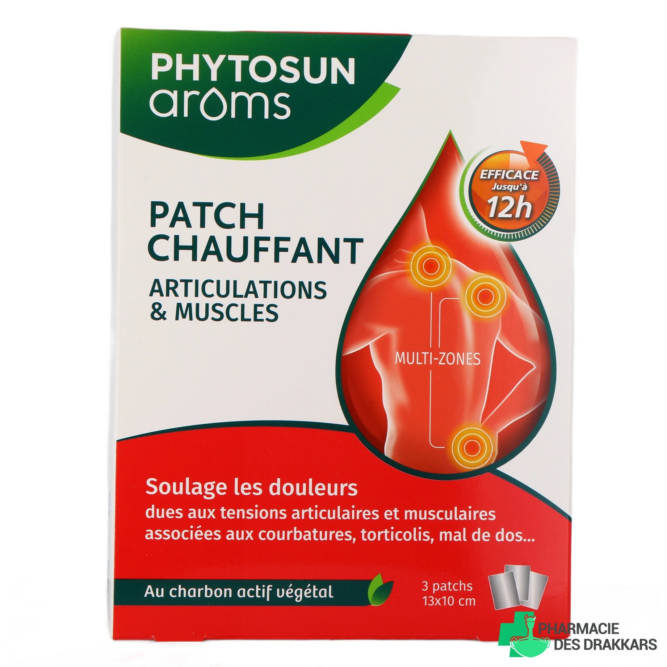 Conditionnement proposé sur notre pharmacie en ligne pour les patchs articulations et muscles Phytosun Aroms : boîte de 3 patchs.