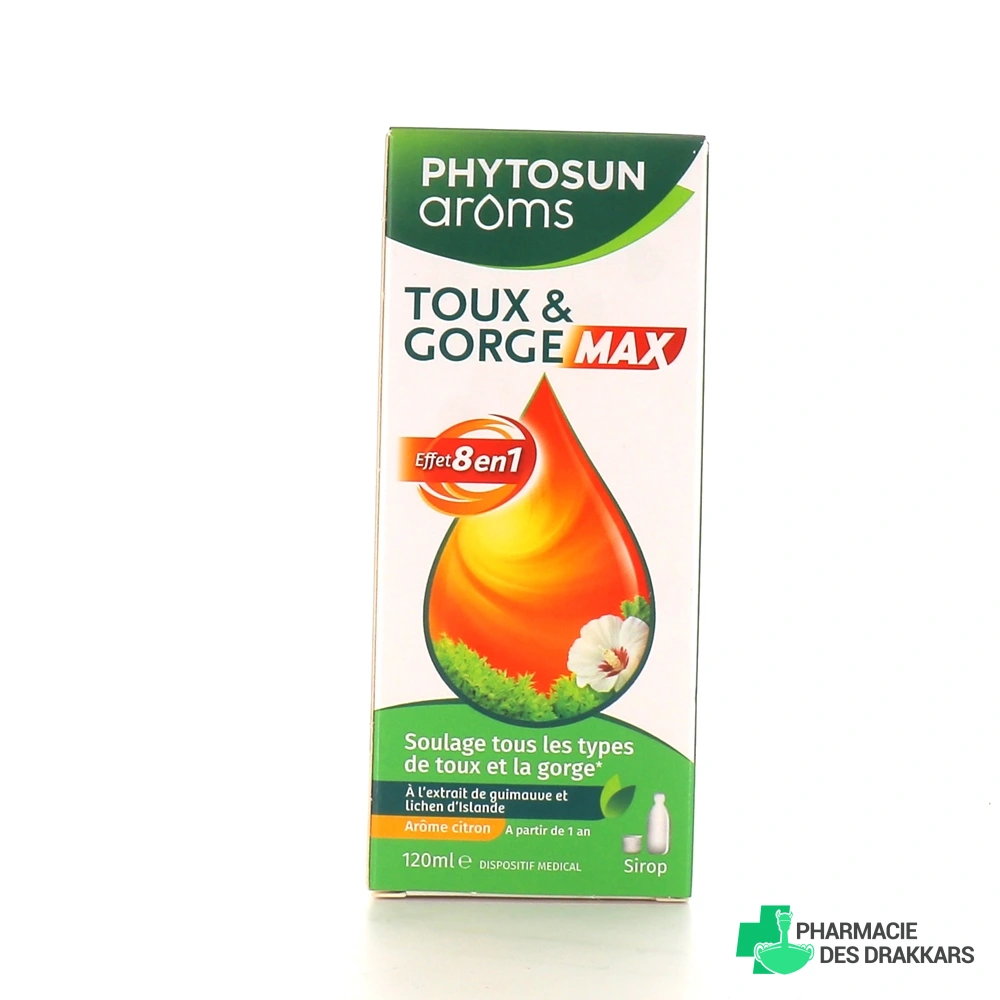 Phytosun Aroms Toux & Gorge Max est un dispositif médical. Il s'agit d'un sirop effet 8 en 1, pour adulte et enfant dès 1 an. Il aide à soulager tous les types de toux et à apaiser la gorge en cas d'inconfort.