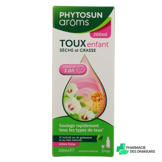 Le sirop toux pour enfant Phytosun Aroms est un dispositif médical destiné à calmer rapidement les toux sèches ou grasses associées aux rhumes auprès des tous petits dès l'âge de 1 an.